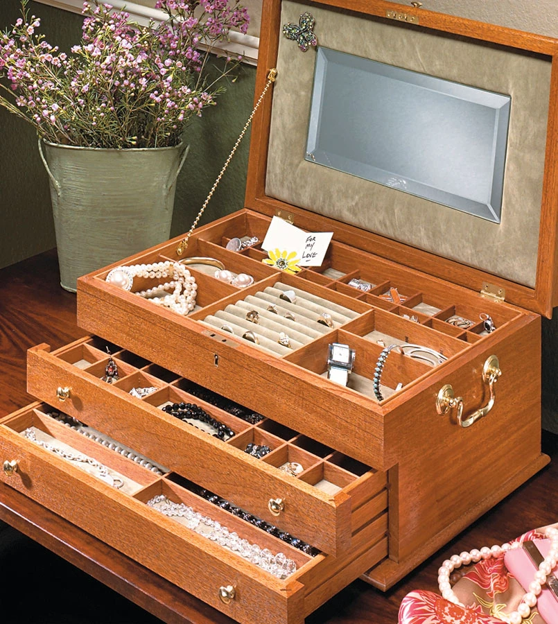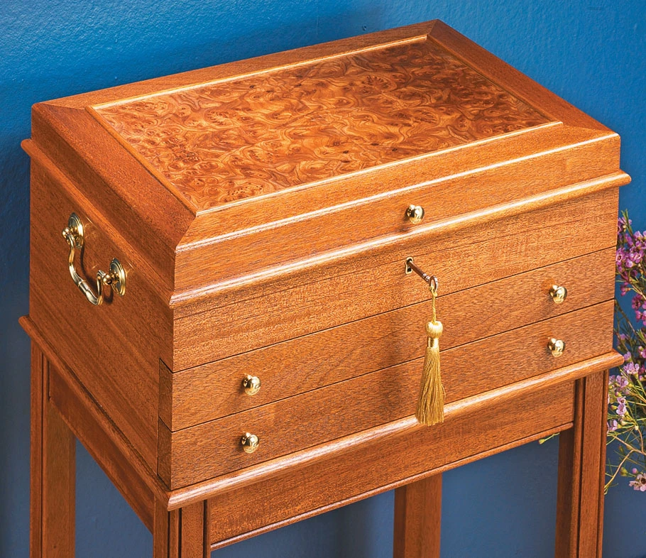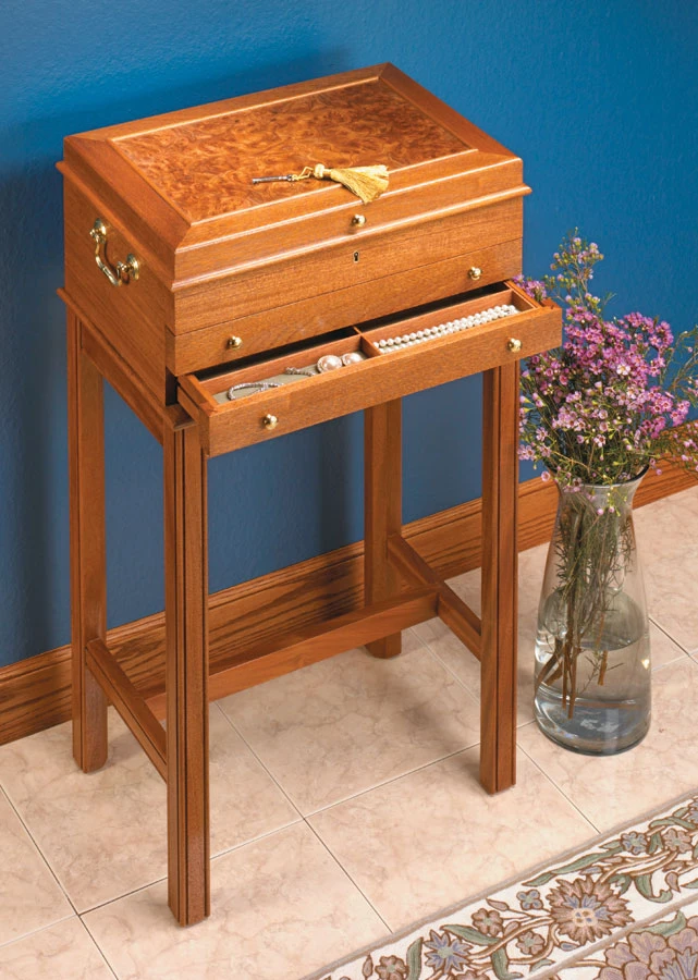When you first look at this jewelry chest, it’s hard to know where to focus your attention. The elegant, veneered lid opens to reveal a beveled mirror and a divided tray. Below this are a couple of mitered front drawers with more intricately divided compartments. And to top it all off, the chest rests on a graceful stand. (It can also sit on a dresser.)