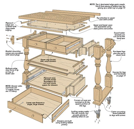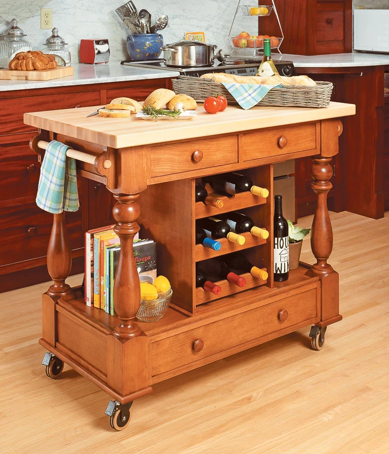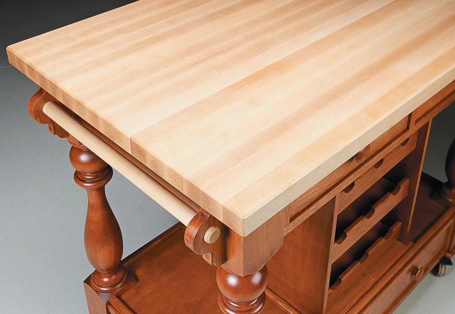 This rolling cart has it all. The large top, made from glued-up, edge-grain maple, provides a durable and attractive worksurface. With three drawers and a large space under the top, the cart is also a great place to store a few often-used kitchen items. The turned cherry legs came from an on-line supplier, but you can easily turn your own if you have a lathe. This cart makes kitchen chores a little easier to tackle.