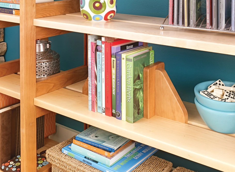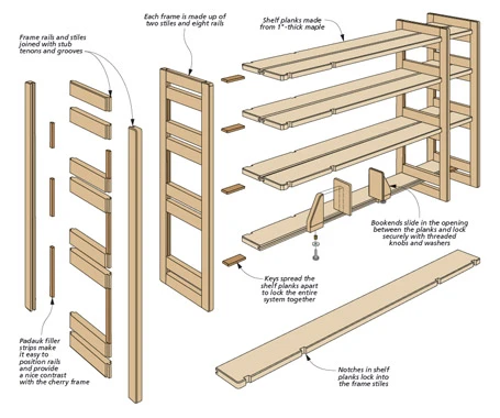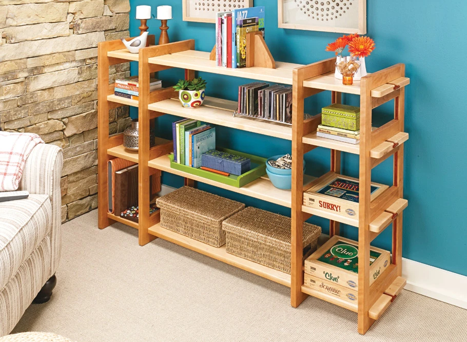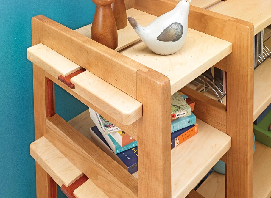 This little knock-down shelving system was designed to be simple and useful. As you can see, there isn’t a whole lot in the way of parts to this setup. A set of four frames provide the basic structure, while shelves that are each made from two thick maple planks pass between the frames. The unique part of the system is how it’s assembled. When they’re butted together, the shelf planks are narrower than the openings in the frame and pass through them easily. Then, driving hardwood keys into grooves at the ends of the planks spreads them apart. Notches cut in the outside edges engage with the frame stiles to lock it all together. If you ever need to take the shelving system apart to move it, you can simply tap out the keys, remove the shelves, and it all breaks down neatly into a tidy stack of frames and boards for storage or transport.