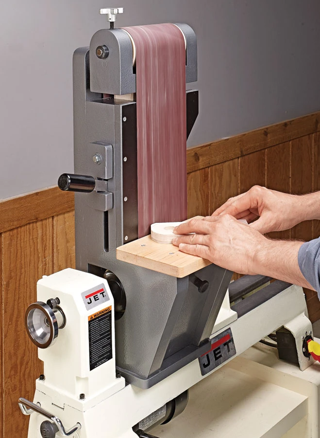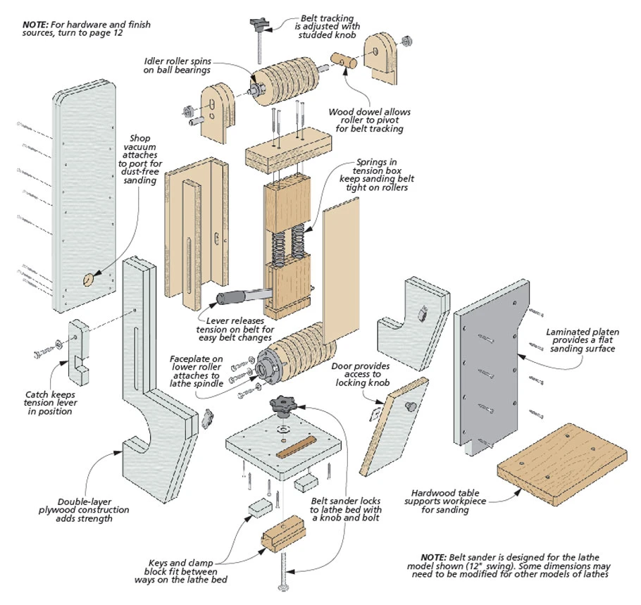 Why not put your lathe to use for other tasks? This belt sander clamps onto the bed of the lathe. The lower roller mounts directly to the lathe spindle for power. Sliding the tailstock with a live center up to the opposite end of the roller provides support as the roller spins. The ingenious part of the belt sander is the mechanism that provides tension and tracking for the belt. A pair of compression springs and a lever-operated cam assembly provide the proper amount of tension to keep the belt tight. And a studded knob at the top of the belt sander makes it a simple task to adjust the belt to keep it perfectly centered. At first it may appear to be a complicated project, but this plan breaks it down into manageable assemblies. It’s really pretty simple when you take it one step at a time.
