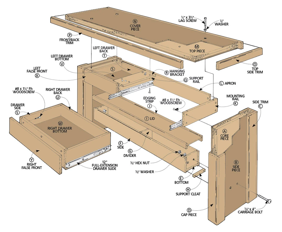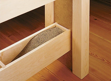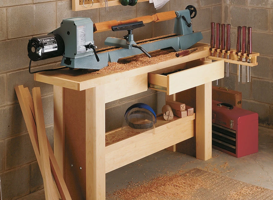 One problem with benchtop lathes is that they don’t have the weight that full sizes lathes possess which can lead to a lot of vibration if they aren’t mounted to a rigid, heavy-duty stand like they one we’ve designed. To add heft to our stand we built it out lumber and particleboard (MDF would work, as well) and incorporated a hollow beam that you can fill with sand for even more ballast to dampen vibrations. But all that weight can be a mixed blessing when it comes time to move your lathe around the shop. To solve that problem, we bolted the stand together so it easily knocks down when necessary. While we were at it, we added a pair of drawers with full-extension slides to store lathe accessories. We also designed an optional pivoting tool rack that positions your lathe tools within easy reach while you’re turning.