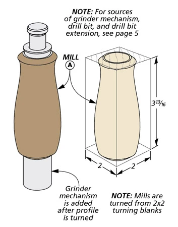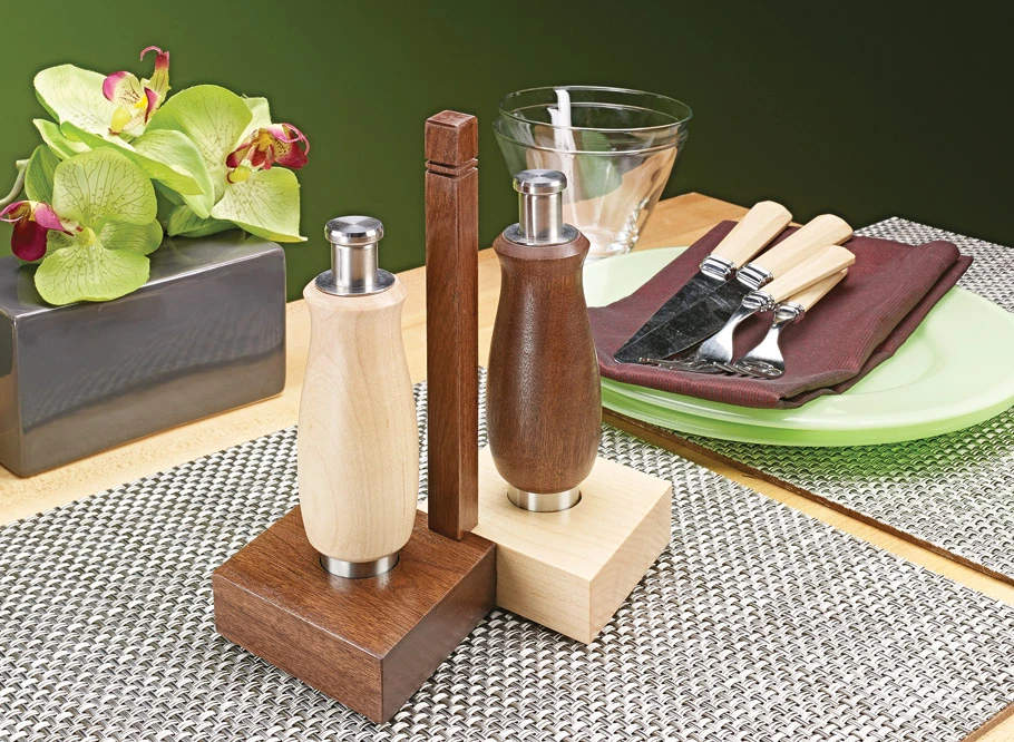 The term pepper mill generally conjures the image of a waiter holding a baseball bat-sized mill over my salad as he vigorously grinds out pepper and tells me to say “when.” The salt and pepper mills in this project are a bit more discreet. Each one is sized to fit comfortably in your palm. And instead of a two-handed rotation action, the mechanisms in these mills work by simply pressing a plunger with your thumb (see photo below). In fact, the only turning you’ll have to do with these mills is at the lathe, when it comes to shaping the bodies of the mills. It’s a good opportunity to dust off that minilathe sitting in the corner of the shop and put it to use.