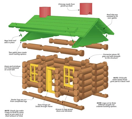 Our Linkin’ Logs are the perfect gift for any woodworker to make in Santa’s workshop. The process of making the logs and accessories is pretty easy using tools you already have. The set of logs you see here is made from inexpensive poplar. They’re larger than usual, which makes them easier for small hands to pick up and put in place. Plus, they offer the ability to add doors and windows. These are made from plywood and fit into grooves in the top and bottom edges of the logs. You can make as many parts as you wish to create more building options. We’ll show you the trick to making identical parts quickly and consistently. I bet you’ll be building log cabins on your benchtop long before you apply the finish.