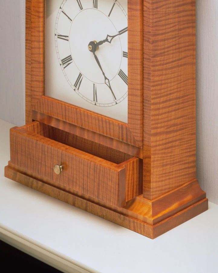 There’s no doubt about it — what grabs your attention right away is the dramatic curly maple. But the clean lines and simple molding of this traditional mantle clock would look great no matter what wood you used. In spite of its elegance, there’s nothing very difficult about building this clock. Everything is held together with simple joinery, and the face and quartz movement are readily available and easy to install.