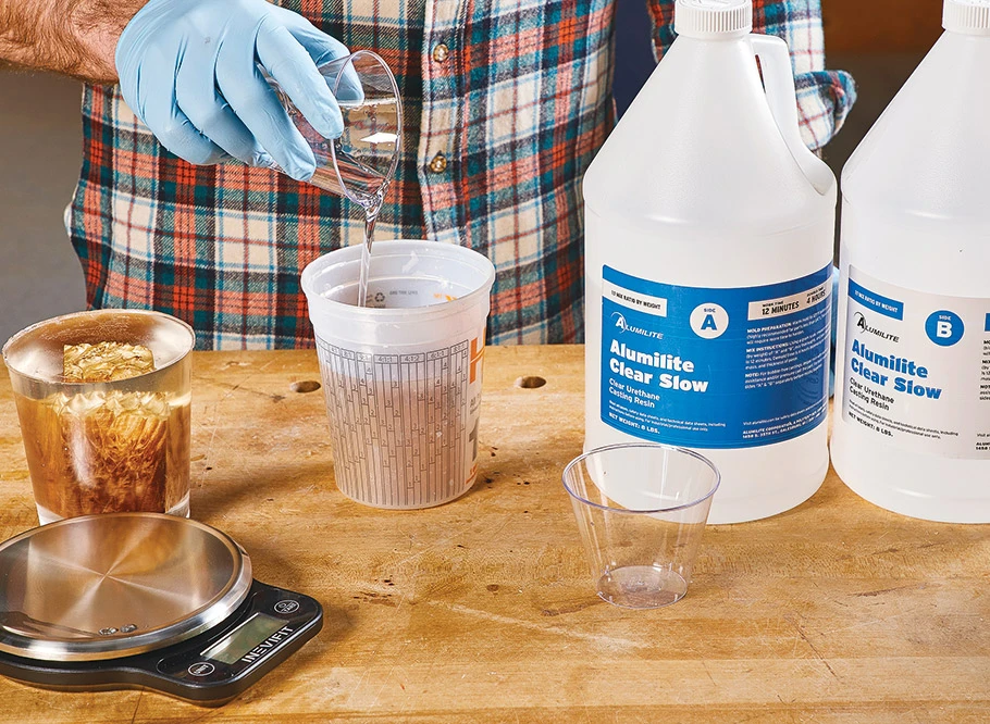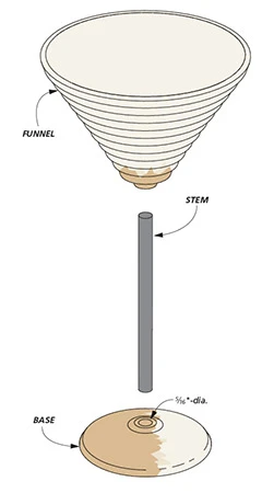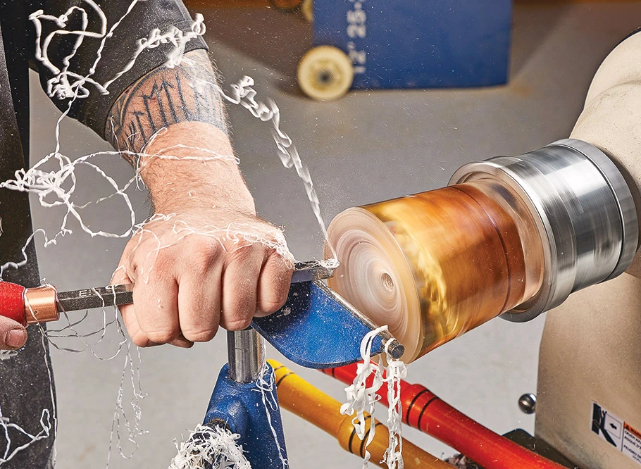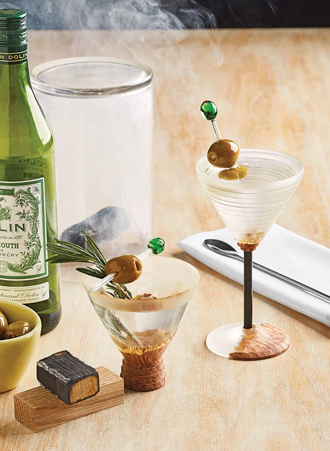 It’s no secret that I’ve taken a head-first dive into turning over the last few years. So when we had an upcoming lathe project, these martini glasses, I was excited to work with the designer on the process. The glasses you see here are the result of our brainstorming. These martini glasses are a blend of casting resin and pieces of maple burl cap. The effect, in my opinion, is striking, and the stepped design turned into the base and the funnel really sets them apart.