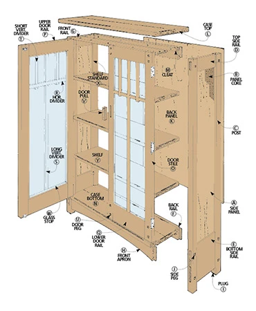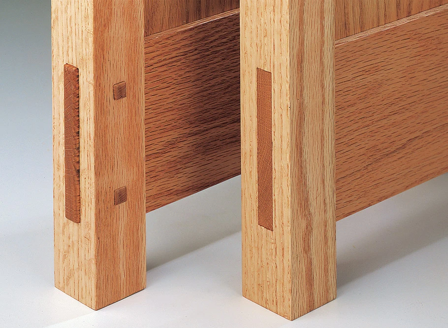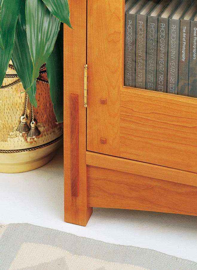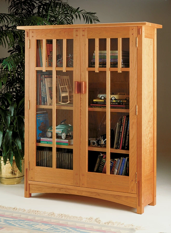 This bookcase is a good example of straightforward Mission-style furniture, with sturdy mortise and through tenon construction, square pegs, and shop-made door pulls. When Gustav Stickley started designing furniture like this in the early 1900s, he had the “common man” in mind. Out with the ornate — furniture should be simple and functional. The result was the Mission style (sometimes called “Craftsman” style furniture). But Stickley was not just concerned with design. Furniture also had to be built in the tradition of the master craftsman. His furniture was built with a combination of machinery and handwork. That’s what I like most about this bookcase. It’s built in the same tradition. Heavy and repetitive tasks (cutting, planing, and drilling) can be done by machine, while the finer details (the through tenons, square pegs, and door dividers) require careful handwork. The whole process reflects Stickley’s concern for quality and craftsmanship.