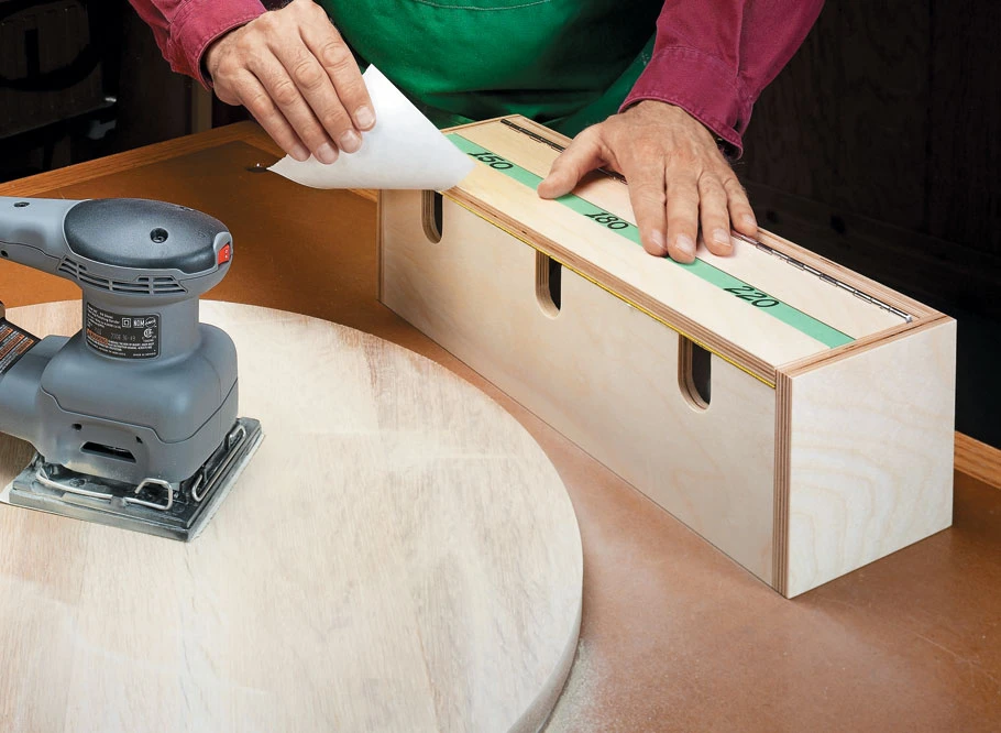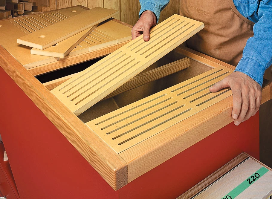 The clouds of dust produced by power sanders make sanding most woodworkers’ least favorite task when building a project. Thankfully, this mobile sanding station makes the job a lot less messy. Designed from the top down to ensure maximum airflow, the worksurface has grates with long, wide slots — a big improvement over the pegboard tops used on many shop-built sanding tables. It also features a 4″-dia. dust port that allows you to hook up to a dust collection system. And a pair of baffles channel the sawdust directly to the dust port. All these great features make it a lot easier to collect dust so it doesn’t end up in the air (or in your lungs).