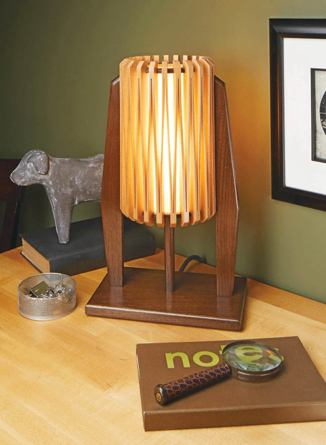 With its round shade and simplistic design, this desk lamp offers a good amount of woodworking, in a small, easy-to-build project. You might think the construction of the round, “louvered” lampshade using common woodworking tools is far-fetched. But the shade is so simple to build, you may find that you can turn out a couple of these desk lamps in a single weekend. The trick is to start with a couple of squared-up blanks. You then cut all of the joinery before “bending” the shade halves together to form a round shade. It may sound difficult now, but the plans will walk you through the entire process. The remainder of the parts for the lamp are just as easy to make. And because of the small size of this project, it’s the perfect place to showcase some attractive wood.