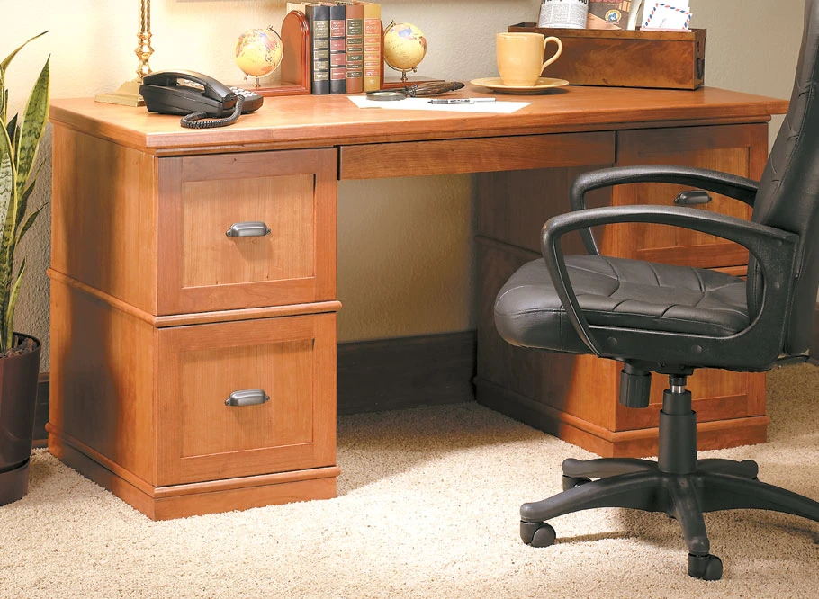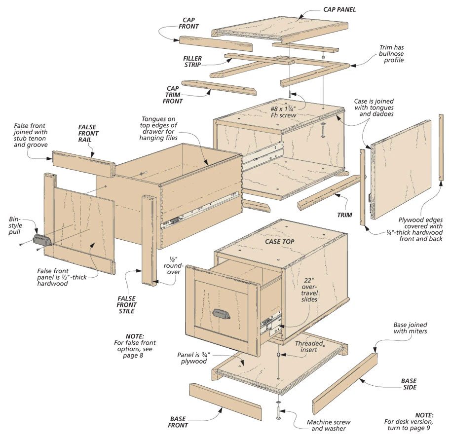 Built in single drawer units, these file cabinets can be put together as a stack of two, three or four. Add a base and a similar cap, and you have a classic-looking file cabinet. Or you can make two stacks of two, connect them with a desk top and a pencil drawer, and you’ve got a handsome desk. So you can build just what you need to fit the “office” space you have.