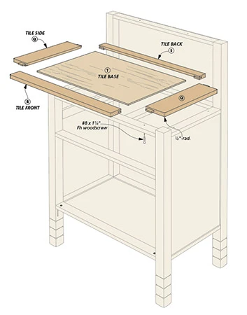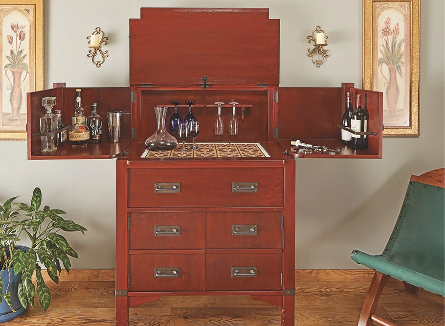 In the heyday of southern California’s Monterey furniture craze, Mason Manufacturing was one of the biggest players on the scene. During Prohibition, discrete bars for the home were one of the more popular items that came out of their furniture shops. And the bar you see here was one of the most prized pieces in that collection. This fold-out, tile topped design is tricked out with all the appropriate accents needed for a well-stocked bar. You’ll make most all the parts needed. From the decorative accents on the bottom of the legs up to the wings that fold out, there’s lots to do woodworkingwise on this cabinet. Also you’ll get to hone your metalworking skills by making backing plates for the pulls, metal corners, the bottle holders for the wings, some stops, and a lid stay. Alder was the wood of choice for this project, it’s the well-behaved cousin of birch. And that red finish — yum. It takes several layers to complete, but worth the effort. So set down that drink and head to the shop — well, tomorrow morning anyway.
