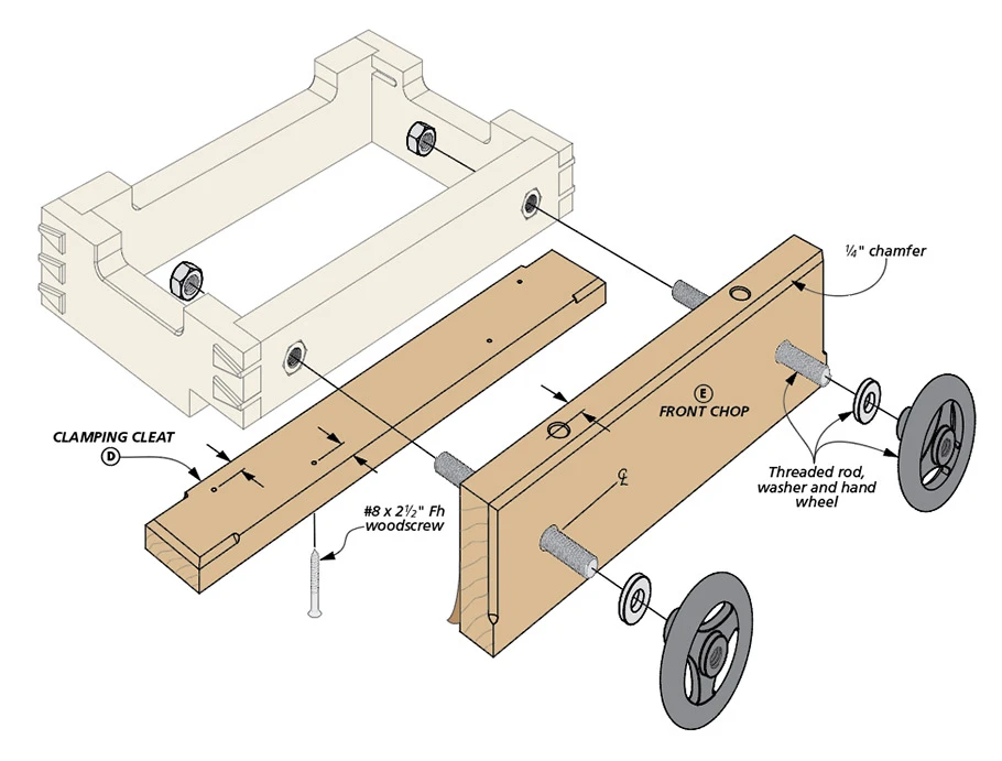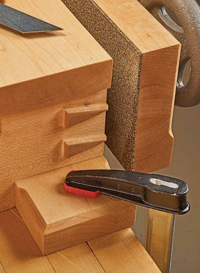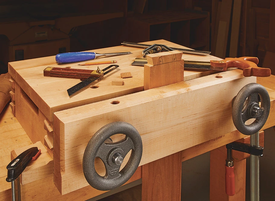 If you’re unfamiliar with a Moxon vise, it’s a benchtop vise designed for doing handwork, such as cutting dovetails. One of the first places this style of vise was shown was in Joseph Moxon’s “The Art of Joinery” from the 17th century — hence the name. Most Moxon vises clamp to the bench with clamps or holdfasts and ours features a small benchtop with dog holes for extra accessories. For tasks such as chopping the waste out of dovetails or for carving, you’ll appreciate the extra height. The heart of any Moxon vise is the pair of hand wheels that move the front chop to clamp workpieces. Here, we’ve opted to go with the best — a Moxon vise kit from Benchcrafted. Yes, they’re a splurge, but they’re worth it in my opinion. If you’re a more frugal woodworker, you could make your own using hardware from McMaster Carr.