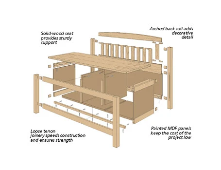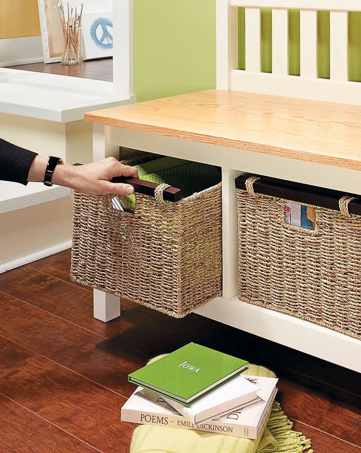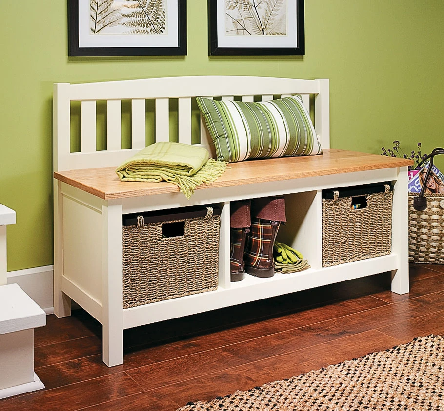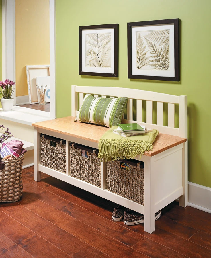 A storage bench is a great addition to an entryway. This design features three bays — plenty of room to stow your shoes and umbrellas. To organize your outdoor gear, you can use inexpensive baskets from a housewares store. It’s a good idea to have the baskets first. This way, you can tweak the dimensions of the bench if needed.