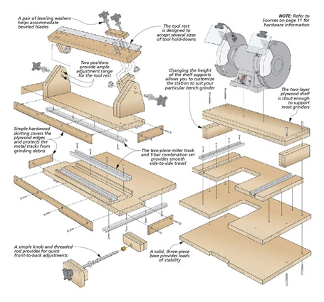 If you use your bench grinder for most of the sharpening chores in your shop, you may have found the standard tool supports somewhat lacking in, well, support. But turning your grinder into a capable sharpening machine with precision adjustments is as easy as building our grinder station. It’ll make previously difficult to accomplish sharpening jobs a breeze. The key to this sharpening station’s accuracy is a miter track and T-bar combination set that allows for adjustment in two directions. The aluminum-edged hardwood tool rest provides ample support and accepts a number of different hold-downs for various sharpening tasks. Building this platform for your grinder might just make it the most-used tool in your shop.
