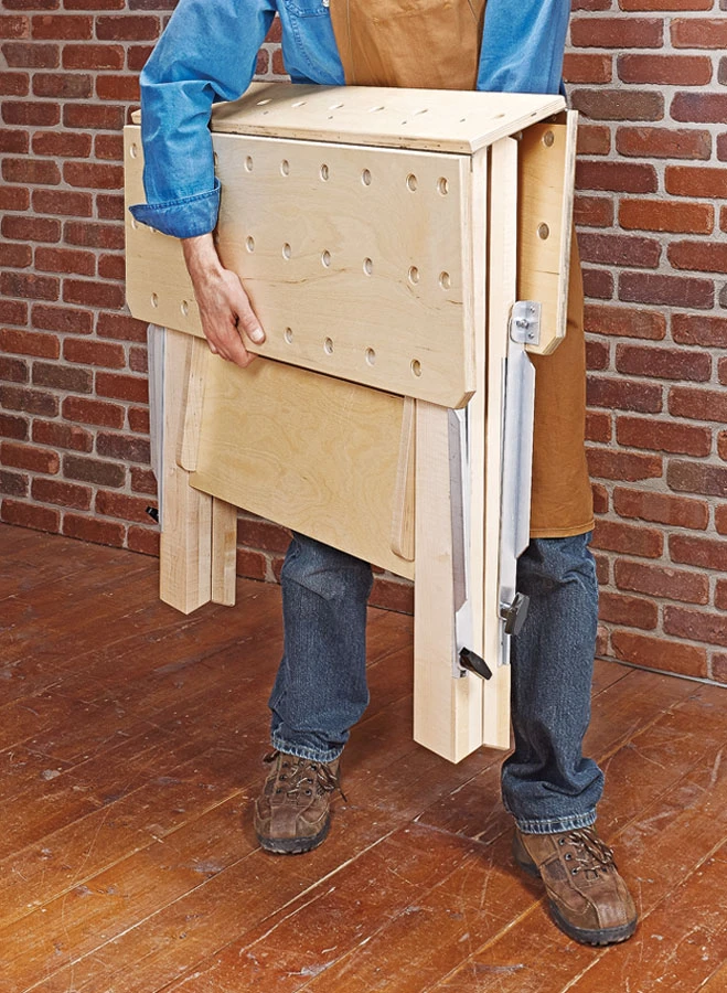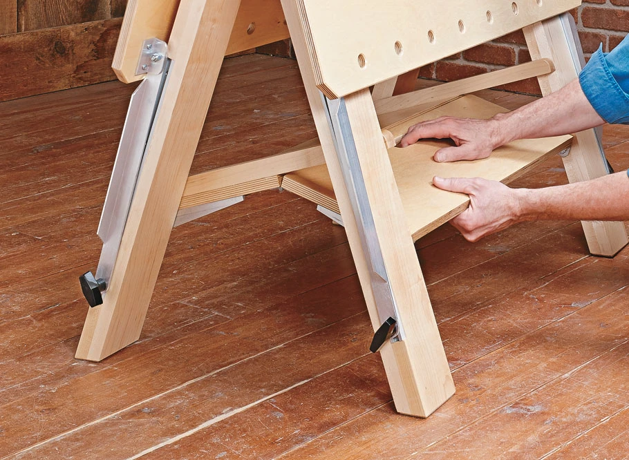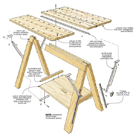 The sturdy, A-frame base supports a large top that folds down for easy transport and storage. And an integrated shelf near the bottom of the base provides handy storage. The shop-made aluminum hardware adds rigidity and is simple to make. And a length of T-track on each leg helps lock everything in place. The best part is that you can easily build this project in a weekend.