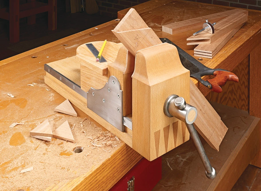 A heavy-duty workbench sits at the center of most workshops, and part of what makes it so capable is that it serves as a platform for accessories such as this auxiliary vise. This isn’t your standard vise, however. First, the vise raises a workpiece to a more comfortable level, whether you’re sitting or standing. Second, the smaller jaws offer greater access to a workpiece and are less likely to interfere with a tool. In addition, you can easily adjust the position of the vise without needing to release the workpiece. The vise rotates as well as extends beyond the edge of the bench. It’s anchored by a mounting bolt that fits into a bench dog hole so you can approach a workpiece from any angle.