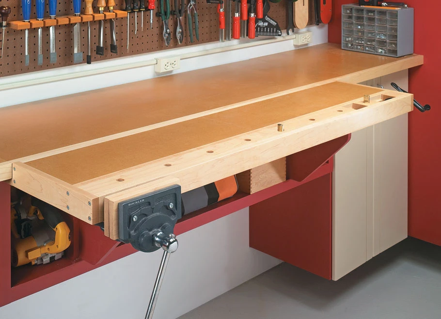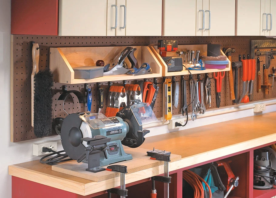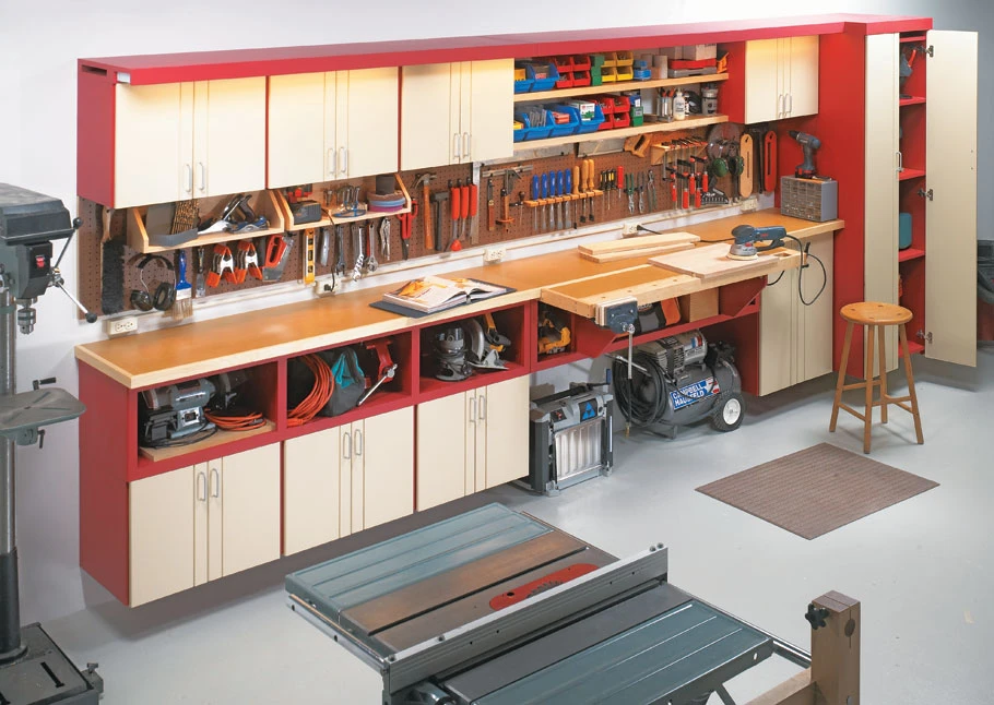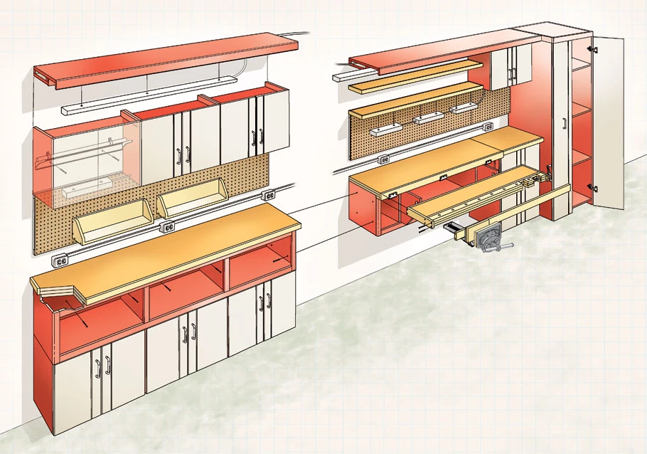 This “one-wall workshop” starts with standard garage shop cabinets you purchase online or pick up from a local dealer. This way, you can concentrate on organizing your shop and working on projects instead of spending time building basic storage cabinets and doors. We’ve “souped up” the cabinets with custom storage compartments, shelves, pegboard, and lighting.