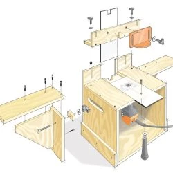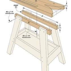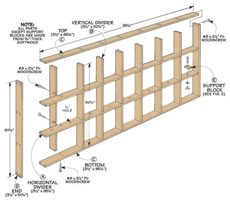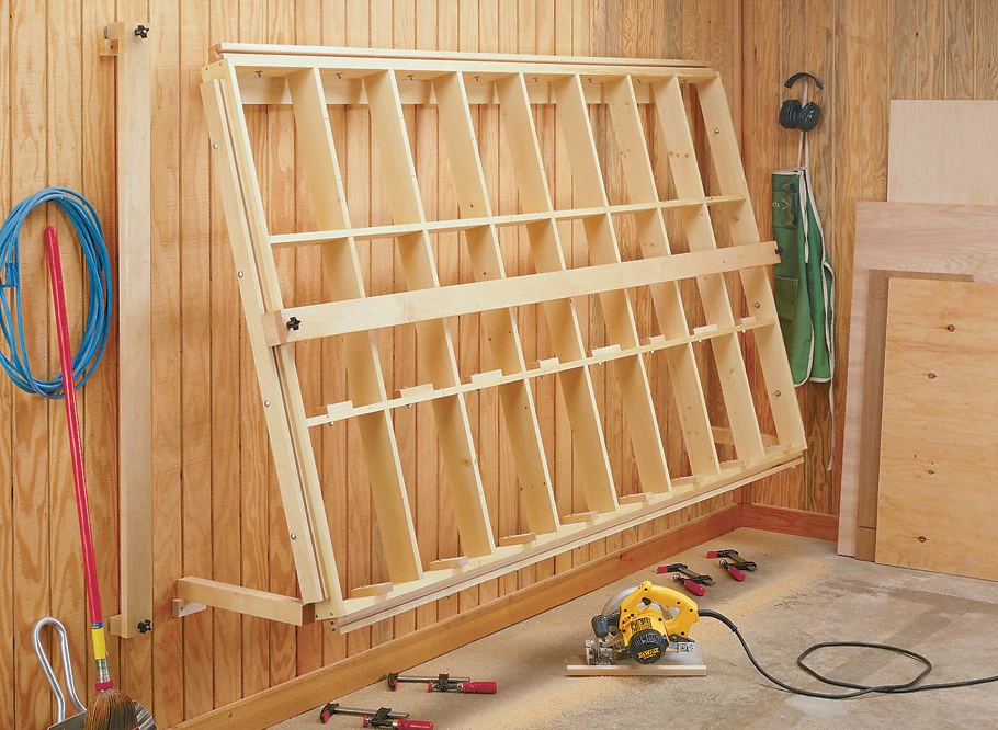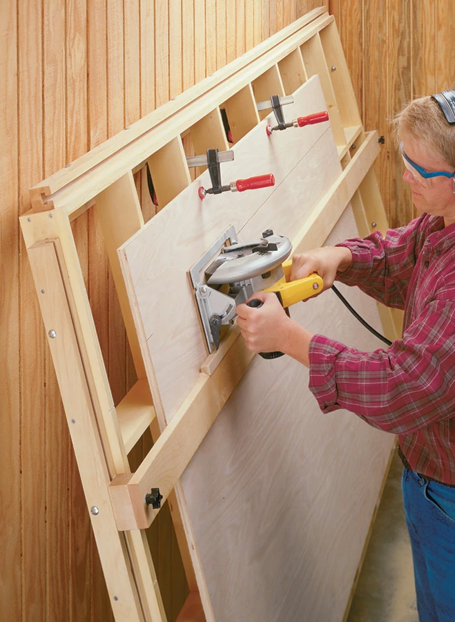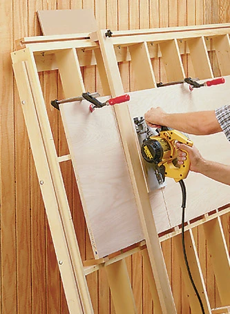 Let’s face it. Cutting large sheets of plywood or MDF is never much fun. They’re heavy and awkward to handle. Not to mention that wrestling a large sheet of material on the table saw can be downright dangerous. The obvious solution is to use a circular saw to break them down into pieces of manageable size. There’s only one problem. It’s often difficult to find enough room to set up a pair of sawhorses and lay the sheet down flat on top of them. To save floor space, this guide mounts to the wall. The panel cutting guide has a large grid that tilts out from the wall and holds the sheet at an angle. With the workpiece resting against the grid, it eliminates the “long reach” required when cutting sheet goods on sawhorses. Plus, the grid supports the entire surface area of the sheet. As a result, the cutoff portion of the sheet won’t sag and cause the saw blade to bind. To produce accurate results, the panel cutting guide has two separate fences that are used to guide the circular saw. If you need to rip a sheet of plywood, just slip a long horizontal fence into the rails on the ends of the grid. To crosscut a workpiece, remove the long fence and install a shorter, vertical fence that slides in the rails on the top and bottom of the grid.