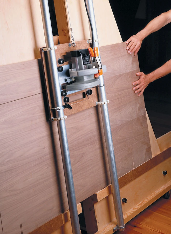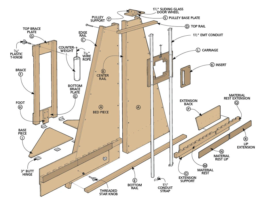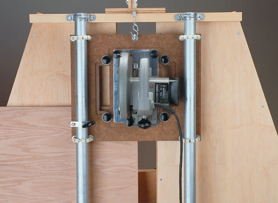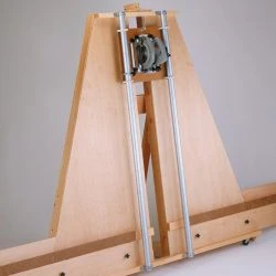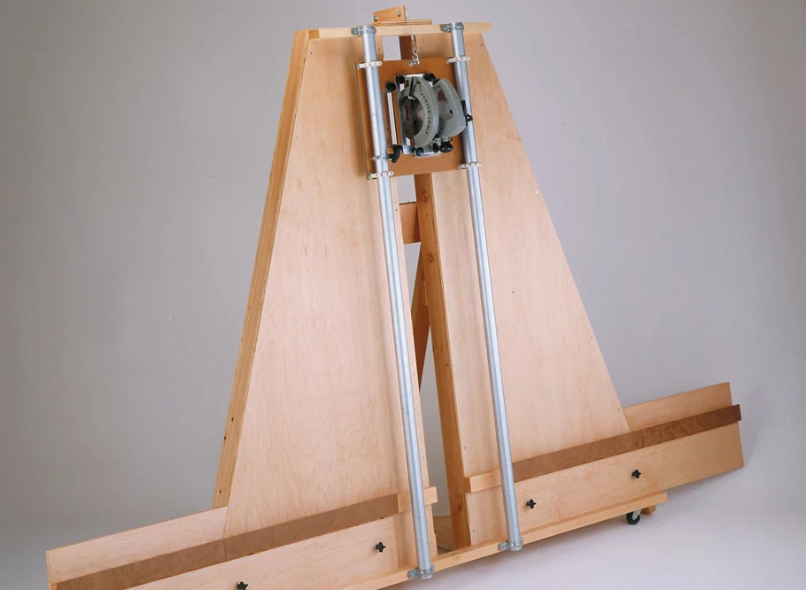 This shop-built Panel Saw makes precise vertical cuts, just by pulling the sliding carriage (holding your circular saw) down across the sheet of plywood. Your saw, mounted in the milled phenolic carriage, travels on guide rails with nylon rollers to cut through plywood or other sheet goods. For ripping plywood, rotate the saw in the carriage. Removable wings extend two feet on each side of the main body to balance the sheet. You rip by sliding the sheet through the Panel Saw. Our Panel Saw has a folding stand so it folds flat against a wall when not in use, and casters make it easy to roll around.