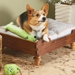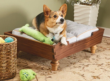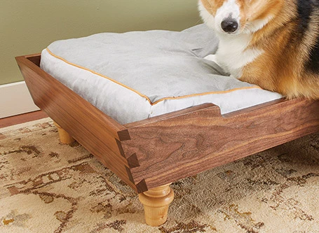Many dog owners today lavish as much attention on their pets as they do on their partners or their children. Whoever coined the phrase, “It’s a dog’s life,” obviously never envisioned a pet bed like this one. Made out of solid hardwood with dovetailed construction, it’s a bed that’s fit for a King — or a Fido. (I’ll spare you any more canine-related puns and references.) This pet bed is constructed very similar to a bed for humans. It consists of a four-sided frame with slats to support a cushion. The slats are dovetailed into rails on the sides of the frame. Shallow cutouts at the front and back of the frame make it easier for the dog to climb in and out of bed. And the entire frame is supported at each corner by a turned foot. While the joinery on this project is stout enough to accommodate just about any size of dog, we’ve designed the bed for a small to medium animal. But it’s a simple matter to scale it up or down to suit your pet. If you do plan on making it a different size, however, it’s a good idea to purchase the mattress first, and then size the frame to fit.
