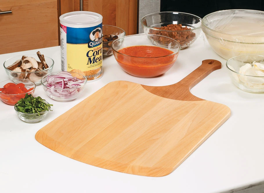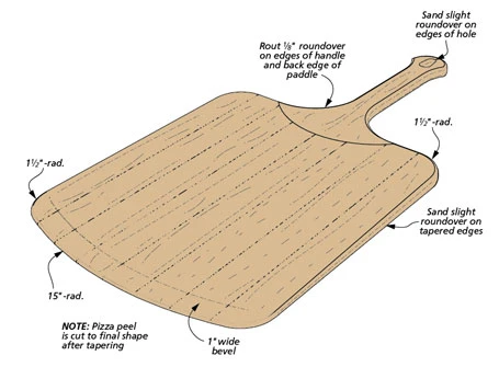 At first glance, this pizza peel looks quite simple — just a flat, glued-up paddle with an integral handle. But take a closer look and there are a few details to work out. For one, the handle and paddle are made separately and connected by a curved, splined joint. This requires shaping these two parts to fit together seamlessly. Another challenge was figuring out a way to taper the paddle along its entire length. For this, we came up with a simple jig that allows you to do the tapering with a planer.