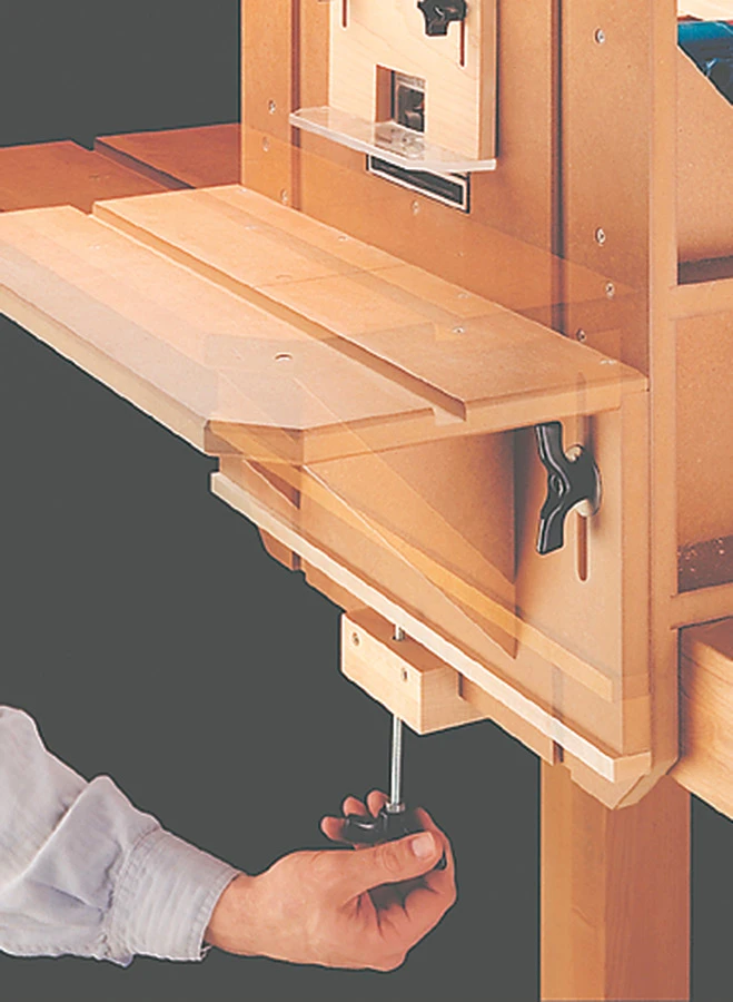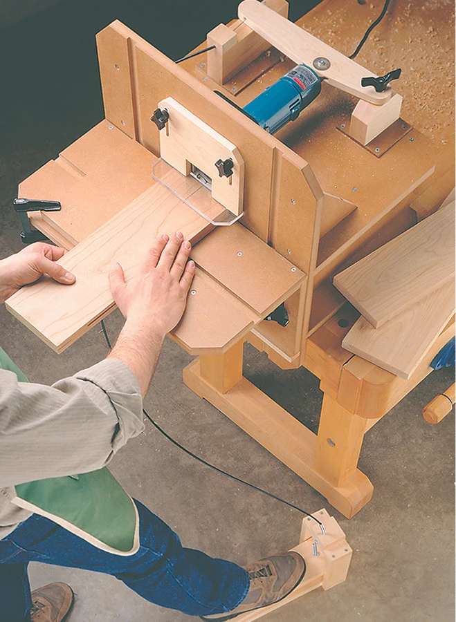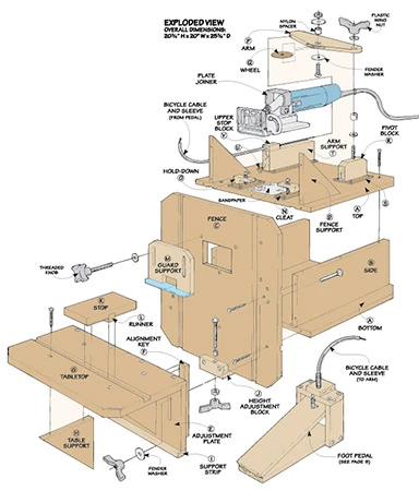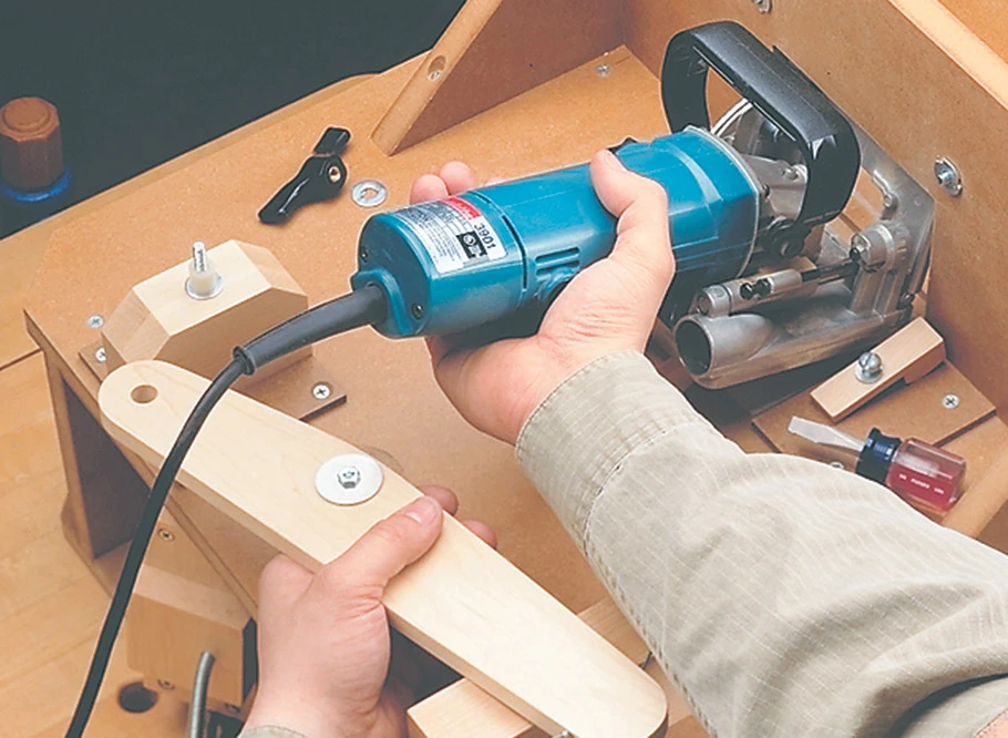 This shop-built table converts your hand-held plate joiner into a benchtop tool. Adjusting a sliding table up or down makes it easy to locate the slot for the biscuit. And a unique, foot-operated plunge mechanism lets you cut the slot without having to clamp the workpiece.