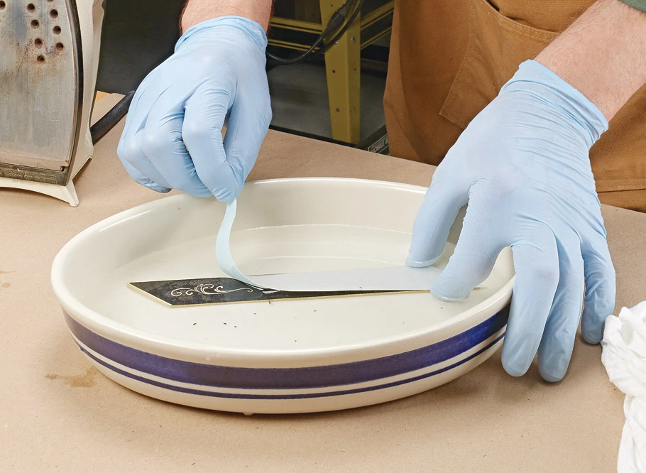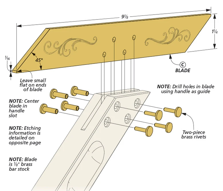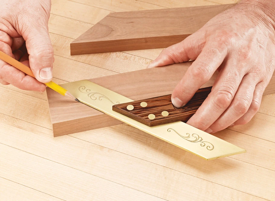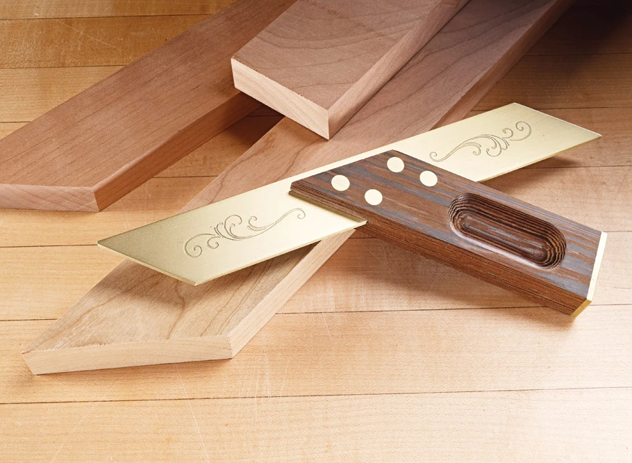 This miter square is simple to make from a piece of brass stock and wood. The wood handle features a brass end cap to help keep nicks and dings to a minimum. And a finger groove machined on both faces of the handle ensures a solid grip. Since it isn’t that large, an attractive piece of exotic wenge makes an affordable handle. The blade and handle are held together with two-piece brass rivets. You can also use this project to try your hand at adding a decorative flair to the brass blade. This scroll design is made with an etching technique that requires just a few special “ingredients“ readily available at most craft stores or online.
