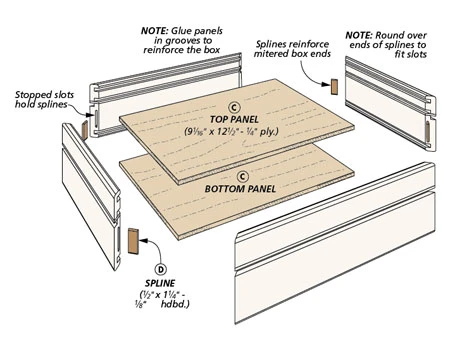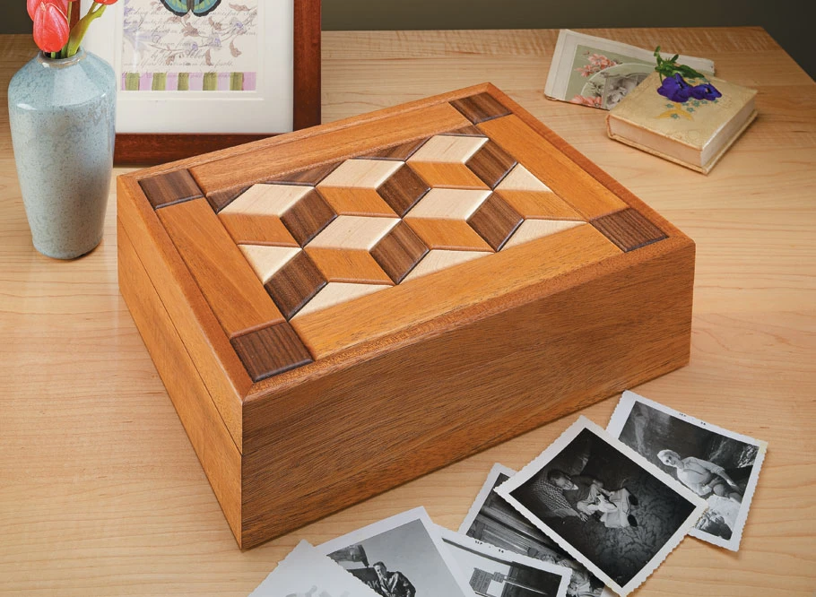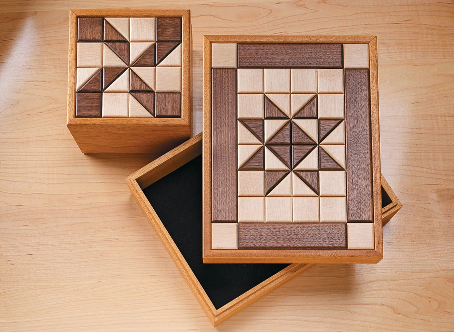 These keepsake boxes are inspired by Early American quilts. The “tumbling block” pattern and the star and pinwheel lids are all replicas of centuries-old, hand-pieced quilts. The quilted effect is created by assembling small wood blocks into a geometric pattern. Each shaped piece is cut from a different type of wood and laid into a recess in the lid so that the grain adds depth and distinction to the pattern. We used mahogany, walnut, and maple for the tumbling block lid and maple and walnut for the pinwheel and star box lids. Building the box is pretty easy. Since the bottom and lid are built as one and then cut apart later, it goes together quickly. Arranging the pattern in the recessed top takes some time and a little patience, but it’s well worth the effort when the box is complete. Once the intricate patterns on your boxes are on display, they’re sure to elicit questions about how you built them. With a little time and careful fitting of the pieces, it’s not that difficult to create beautiful boxes that remind you of your grandma’s quilts.