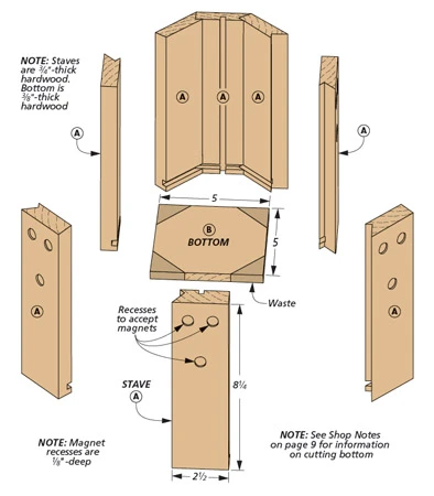 You might think that building this eight sided knife block involves some complex miters. That’s not the case. A few minutes worth of setup and a special router bit in your router table will have your knife block ready to take shape. In addition, you’ll get to work on your veneering skills as well.