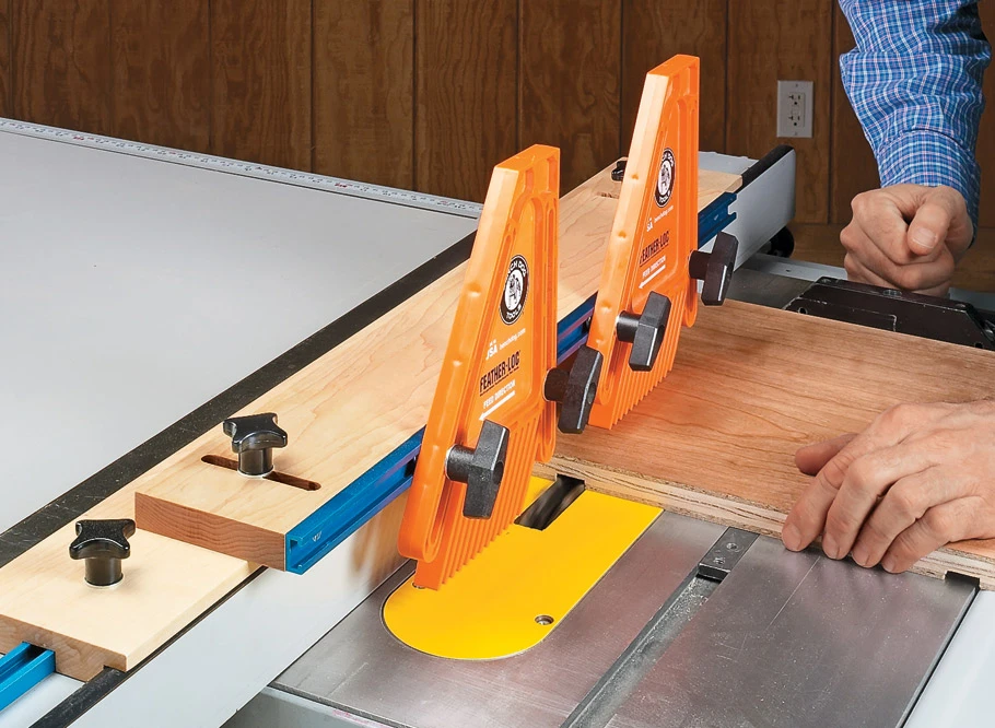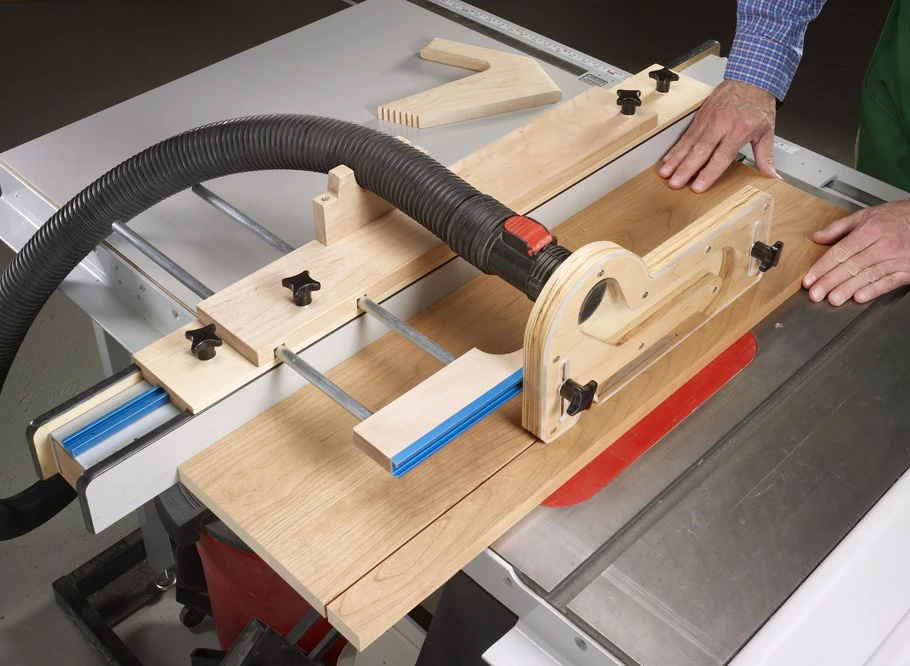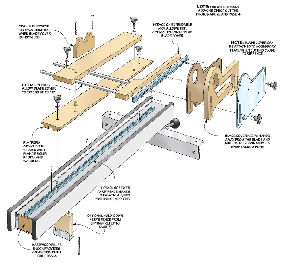 The accessory system you see here starts with a platform that attaches to your rip fence. It accepts several handy add-ons. There’s a stop for making short crosscuts, a plate for attaching featherboards, and a dual-purpose fence for rabbets and wide workpieces. Finally, there’s a dust-collecting blade cover to pull away chips and dust right at the source. Each accessory attaches quickly — so you’re more likely to use it. And you can make the whole set in just a few hours. You’ll find it’s time well spent.