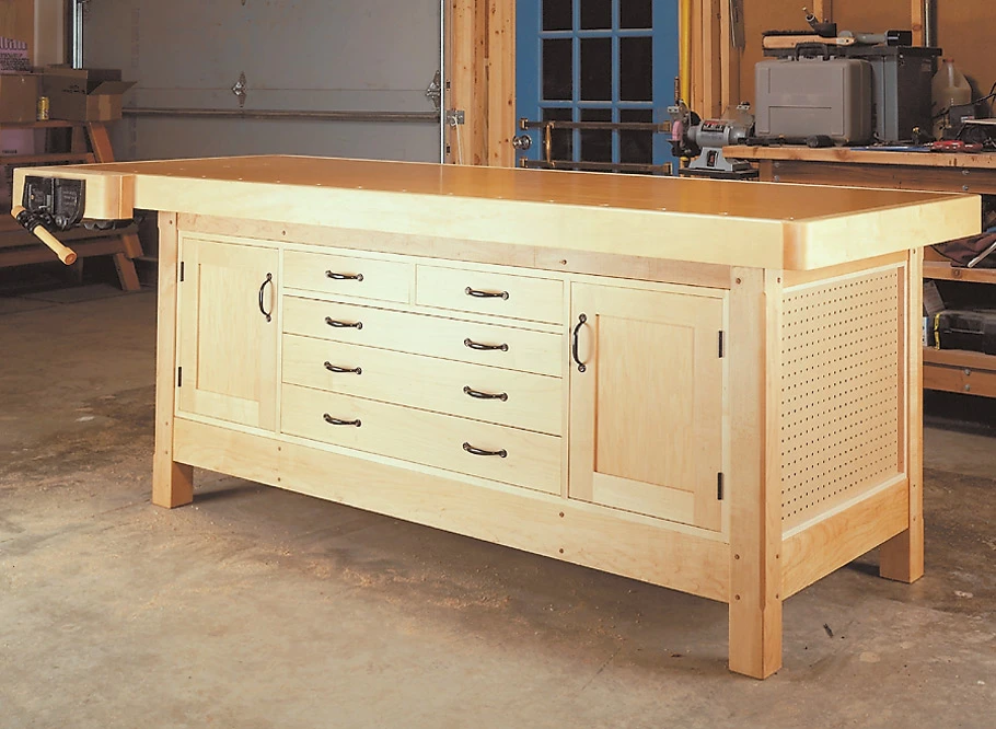 Although the size of this bench is what you first notice (it’s nearly eight feet long and three feet wide, not including the vise), it’s really the construction that makes it interesting. It’s a blend of old and new technology. The base is built of heavy, solid lumber, using traditional mortise and tenon joinery. But the top is constructed primarily of MDF (medium- density fiberboard). So as well as being flat and stable, it has the additional benefit of being quick and easy to make (unlike a top that is glued up from solid wood). Another nice feature are the rows of dog holes along the front and left side of the bench. Combined with a few simple accessories , these make it easy to hold a workpiece while routing, sanding, or planing.