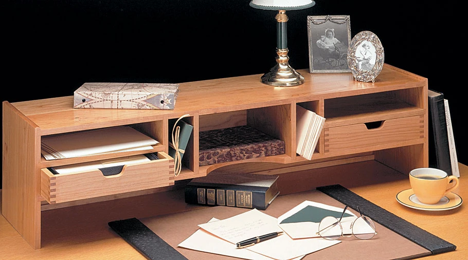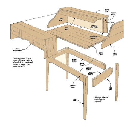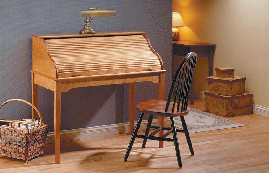 Glide the tambour door open along its “s-shaped” track and you will find a useful desk organizer with drawers and slots. But the most important feature of this desk may be how easily everything goes together. From cutting the tapered legs to gluing the slats to the canvas for the tambour door, this plan gives you all the step-by-step information you need to guarantee the construction goes like clockwork.