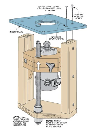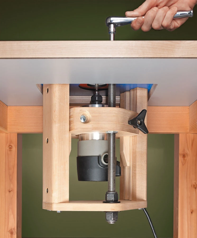 This full-featured lift provides all the benefits of a commercial version, without the cost. It works with almost any mid-sized router and its straightforward design makes it simple to build. Basic materials and off-the-shelf hardware are all you need to upgrade your router table in just one weekend.