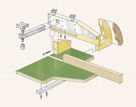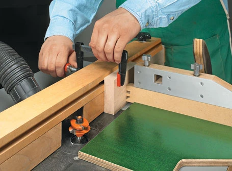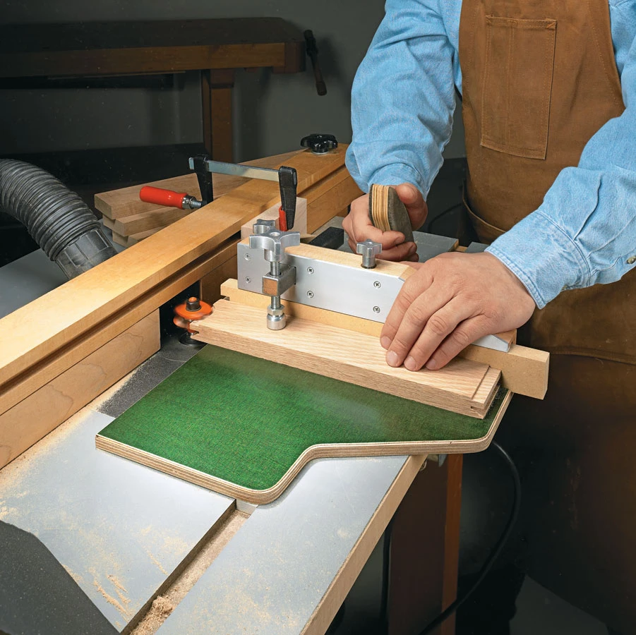 A router table is a great tool for producing tight, crisp joints. But routing across the grain of a workpiece can be a problem. This sled makes it easy. Right behind the workpiece, you’ll find an MDF backing strip that supports the workpiece to eliminate tearout. And the hold-down locks even narrow workpieces firmly in place to keep them square as they move through the bit.
