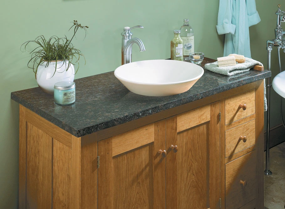 Bathrooms have changed. What were once strictly functional spaces have given way to rooms with a more “furnished” appearance. This bathroom is a perfect example. The focal point of the room is a cherry vanity that’s designed to look more like a piece of furniture than a utilitarian cabinet. With its solid-wood panels, tapered feet, and pegged joints, the vanity is inspired by traditional Shaker design, a style that’s also right at home with many different styles of furniture. Notice, too, how replacing the wood top with a granite slab gives the vanity a more contemporary flair.