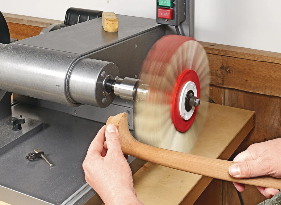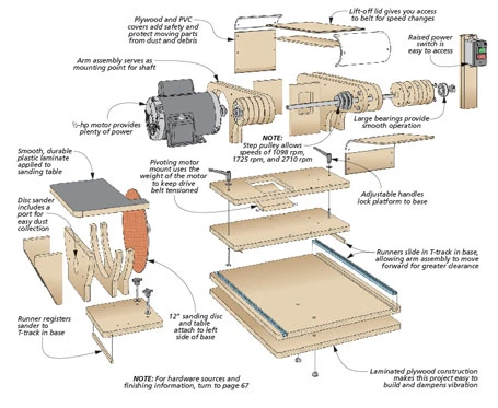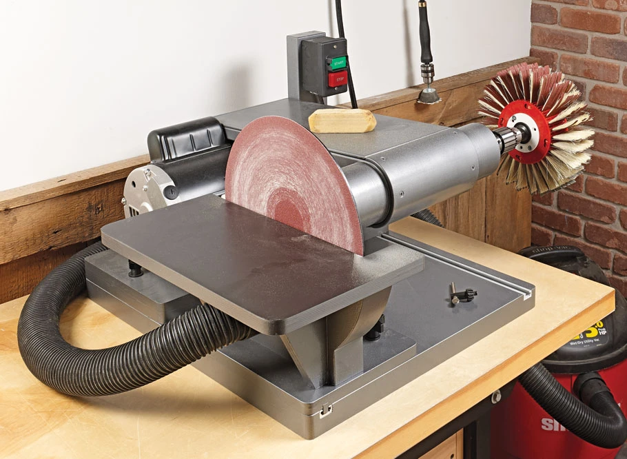 The combination sanding machine you see here unites the function of several tools into a compact benchtop unit. The key to its versatility is its simple design. A motor in the back drives a double-ended shaft up front. The shaft accepts a wide range of attachments. One unique feature is that the motor and shaft assembly can slide forward on the base. This creates more free space around the front end for sanding large and complex-shaped parts. The machine is mostly constructed from laminated plywood assemblies that are durable and quick to make. The result is a low-cost, versatile tool.