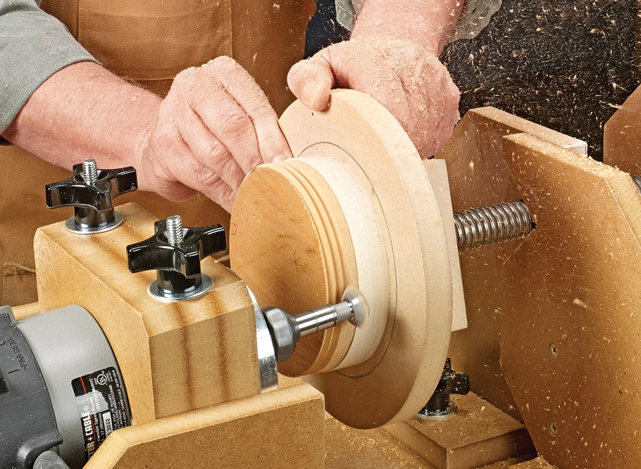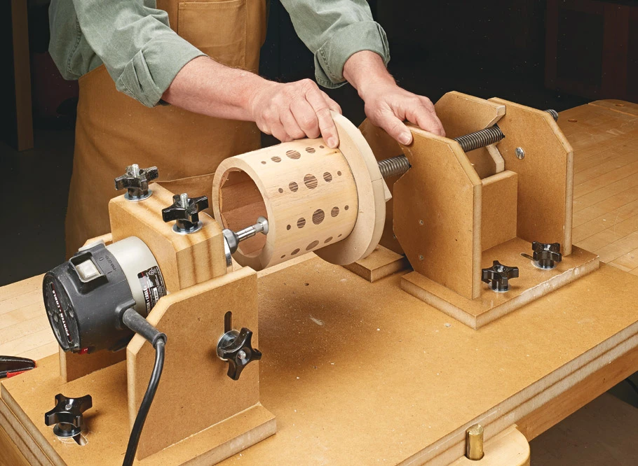 When it comes to cutting threads in wood, there are a variety of pre-made threading kits available to purchase. Most of them are pricey and don’t offer a way to make large threads. This shop-made system offers cost savings and the ability to create large threads. The jig is a little like a lathe inside out. Attached to one end of the base is a router that’s held in place by a carriage. Opposite the router is a platen carriage that’s made up of two halves. These halves close around a length of Acme threaded rod. Epoxied to the end of the threaded rod is a platen. You’ll do all the thread cutting — internal and external — with your parts attached to this platen. Once the platen assembly is locked into the carriage, it’s slowly rotated by hand into the spinning router bit.