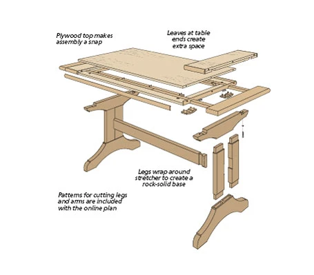 The inspiration for this table comes from traditional trestle table design. It features a large top with breadboard ends on a sturdy base. But it has an interesting twist — each breadboard end slides out to accept a leaf.