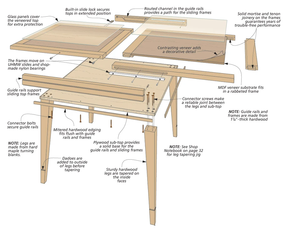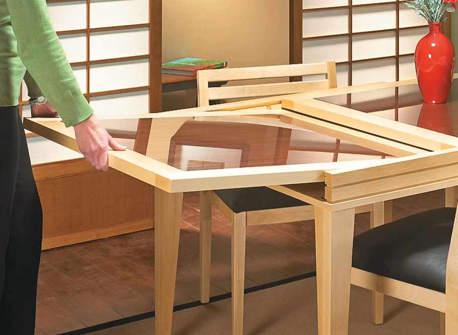 Whether it’s a place for dining or entertaining, you can’t beat the convenience of an expanding table. Normally, though, to expand a table, you’d have to pull it apart and drop in a leaf. Then you need to find a place to store the leaves where they don’t get damaged when you’re not using them. This table solves the problem by using two “nested” tabletops. The upper top pulls out, then the lower slides up and locks into position level with the first. The good news is the sliding tabletops don’t require any unusual hardware or difficult construction techniques. They’re built with mortise and tenon joinery and slide-in hardwood guide rails you can make at the router table.