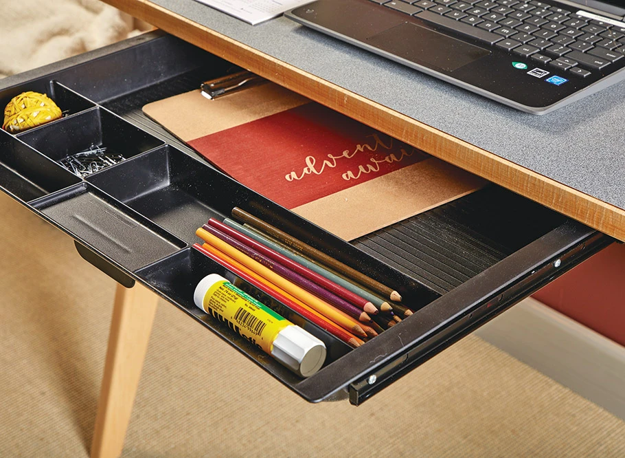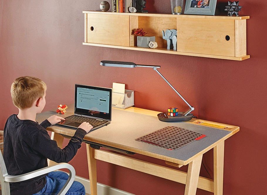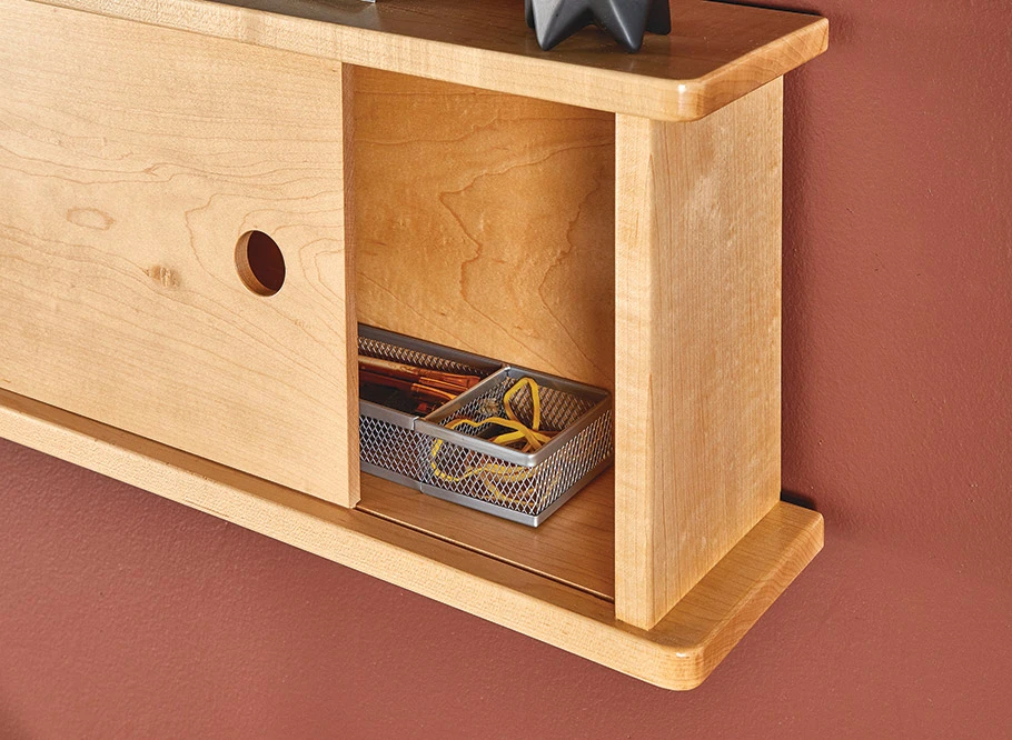 Looking at the desk, you can see that not only is it the perfect place for a student to learn at, but its modern design makes it equally attractive for an adult working at home. The maple construction comes together quickly, and a pull-out tray keeps all your supplies close at hand. For a little more storage, we designed a simple wall shelf to sit above the desk. It matches the desk nicely and offers more storage than the desk alone. An additional benefit is that it transforms the desk from just a table into more of a work area.