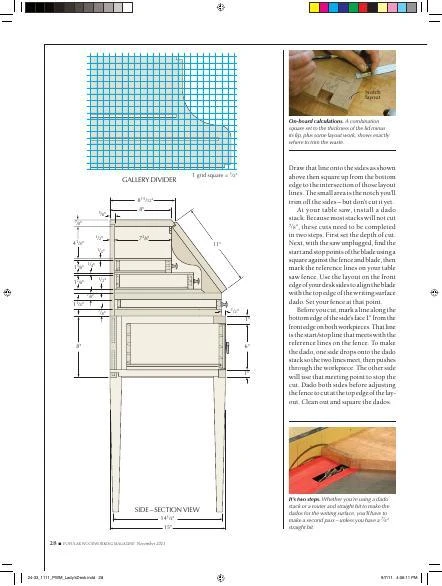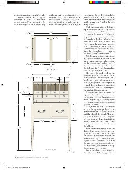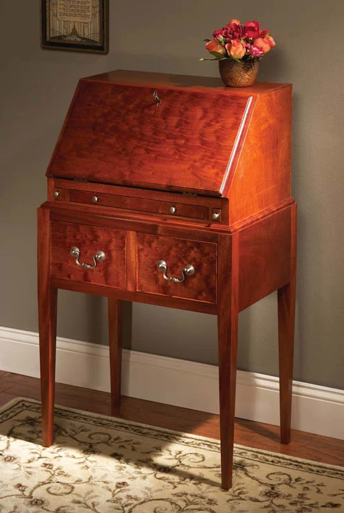 In particular, its petite size and the slender, tapered legs. It doesn’t hurt that the piece has two amply sized drawers that are great for storage, or that there is far more eye candy behind the drop front. And most of the parts are, like the investment in materials, small.