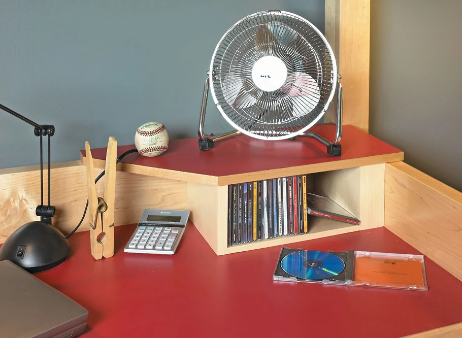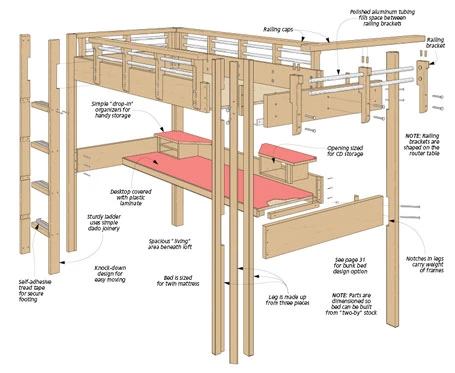 It’s really more than just a bed — it’s practically a furnished two-story apartment. Let’s start the tour on ground level. Here you’ll find the spacious study featuring a large desktop with handy storage. And from there, it’s just a short climb to the comfortable, secure, “second floor” loft. There’s no denying this is a large-scale project, but you’ll find that building it doesn’t have to be a big job. For ease of moving and assembly, it all breaks down into manageable pieces. You build each section with simple but solid joinery and then turn to carriage bolts and a wrench to hold everything together. And if two beds work better for you, there is a bunk bed option.