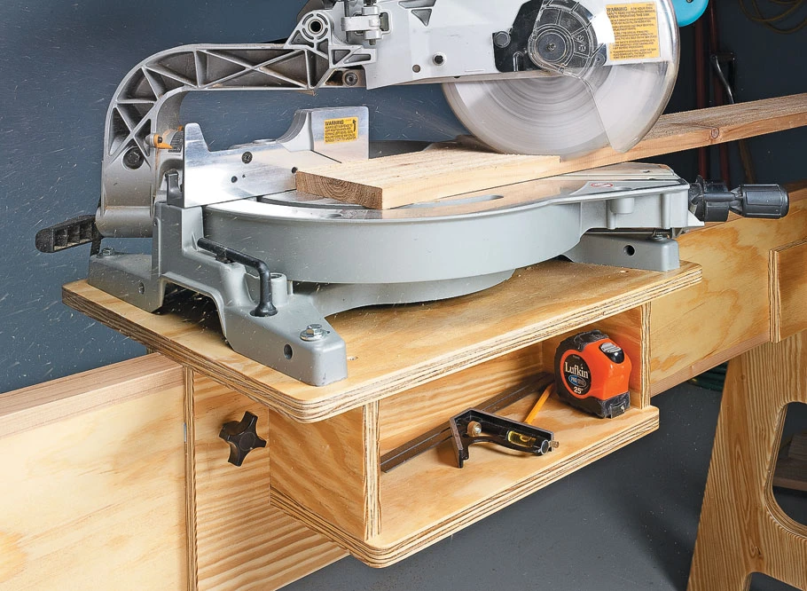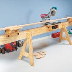 A compact miter saw is a pretty versatile tool for everything from rough cutting long boards to accurately mitering molding. The small size makes it easy to take it right where you need it. There’s a downside to that small size, however. On its own, the saw table is too small to adequately support long workpieces. The solution is the modular workstation you see here. It’s made up of three sections and goes together in seconds to create a sturdy, versatile cutting station up to 17′ long. And each section is lightweight so you can set it up anywhere from your garage to the backyard.