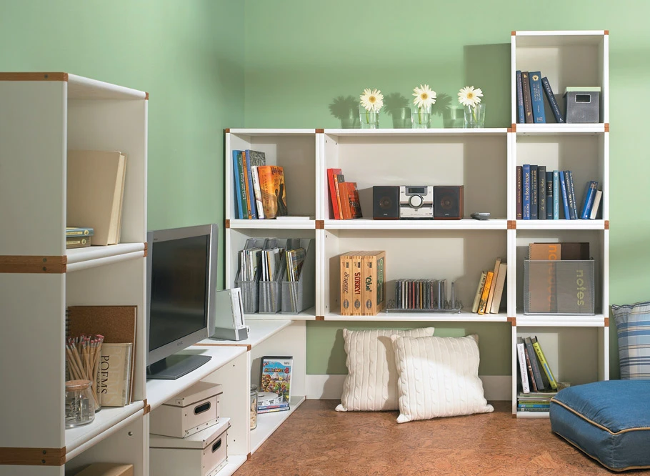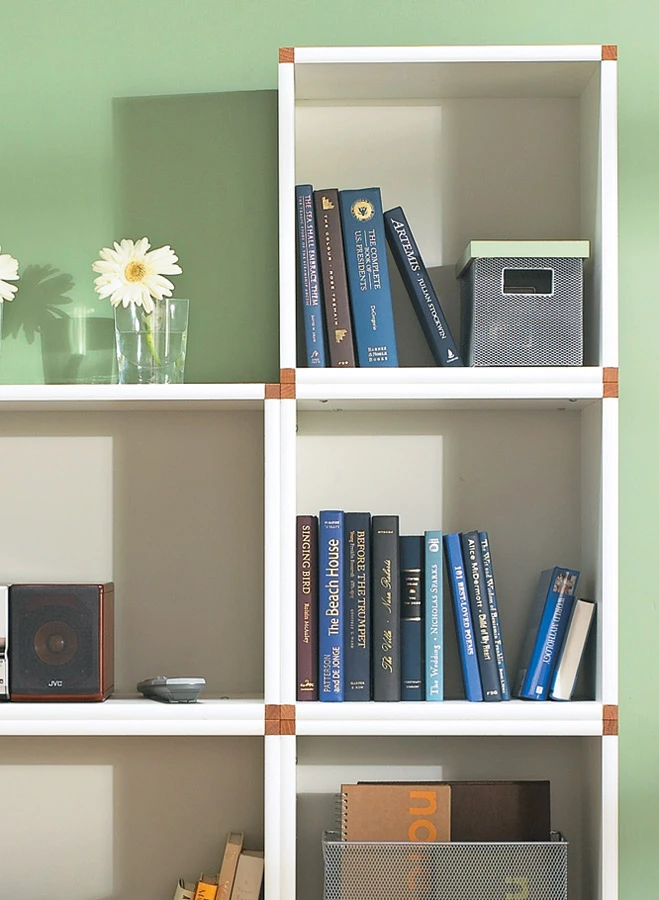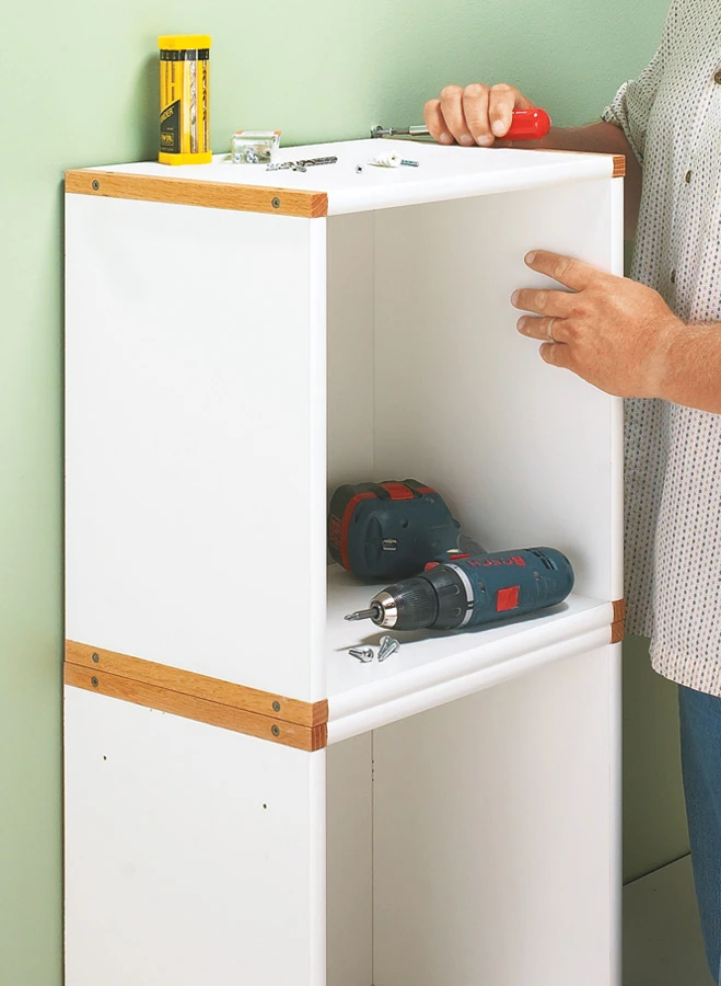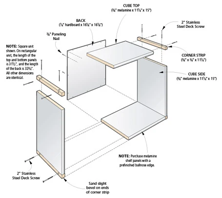 Create a system of organization that’s easily customizable to fill any space and hold any items that you desire with these stackable storage “cubes”. The system consists of two sizes of cubes: One is square, and the other is rectangular and twice the length of the square. That means two squares match the width, or height, of a rectangle, depending on how you stack them. Besides being versatile, these units are also made with just a few parts — melamine, strips of oak, hardboard, and screws. This makes them easy to build, and the contrast of the melamine with the oak creates a clean, contemporary look.