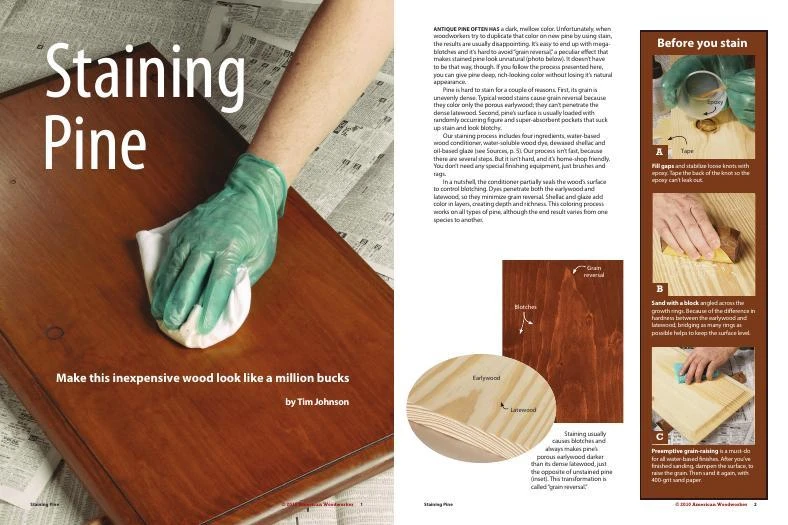 Antique pine of ten has a dark, mellow color. Unfortunately, when woodworkers try to duplicate that color on new pine by using stain, the results are usually disappointing… (purchase to keep reading)