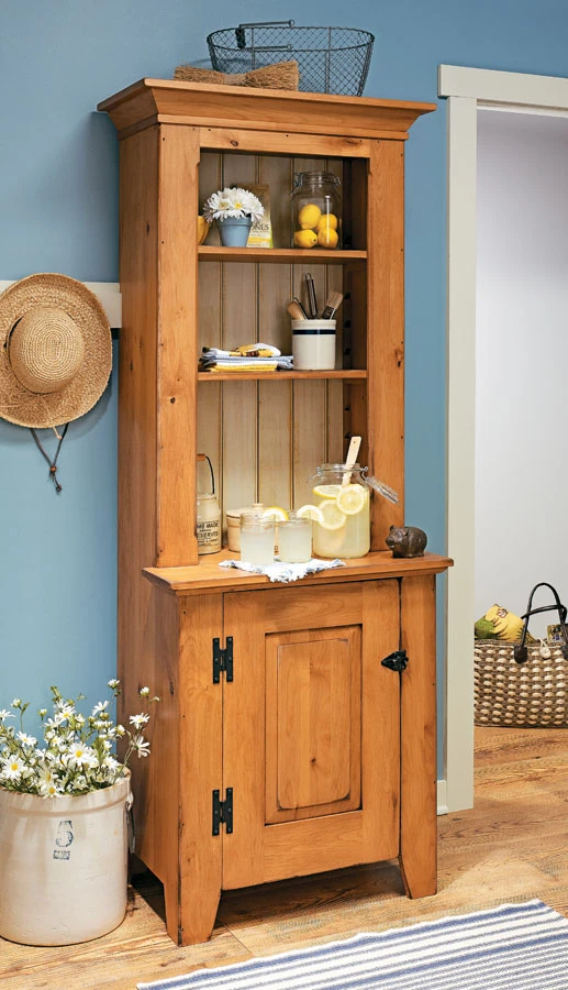Simple, country-style furniture has an unpretentious charm that’s attractive and comforting in these complicated times. This classic step-back cupboard hits that mark square on. As you can clearly see, the ornamentation on this piece is simple and subtle — nothing the least bit fussy. And the practical uses for the cupboard are unmistakable.