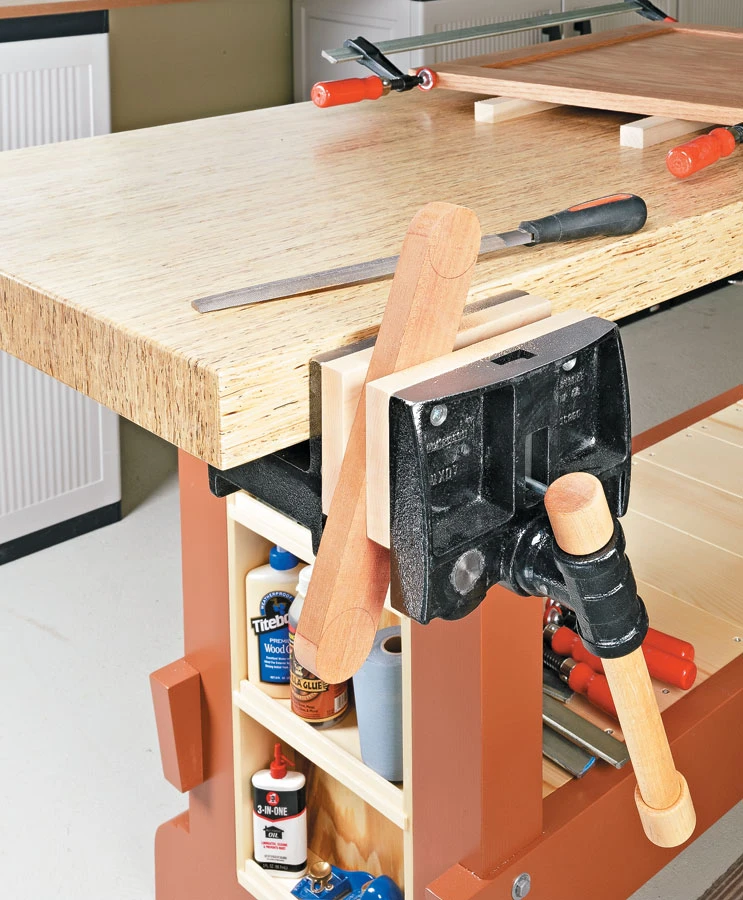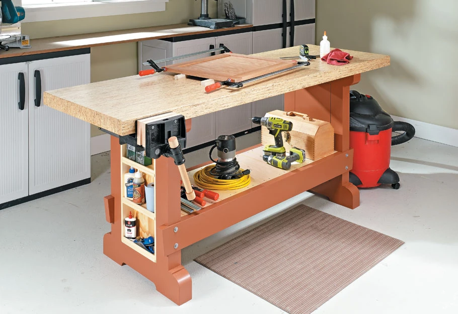 The centerpiece of most shops is the workbench. But a quality bench can be expensive to buy, and building your own can be costly and time-consuming. That’s why we designed this simple, low-cost bench. The base is built from construction-grade lumber. The top is assembled from an engineered wood product called TimberStrand, available at your local lumber supplier. This is a solid workbench that won’t cost an arm and a leg. And the simple construction means you can complete this project in a weekend.