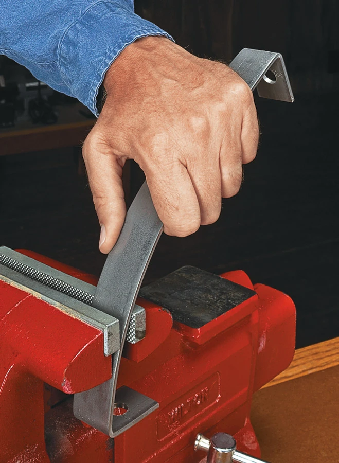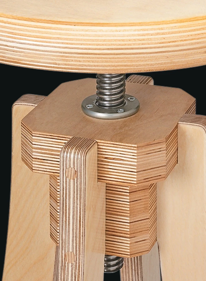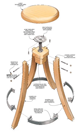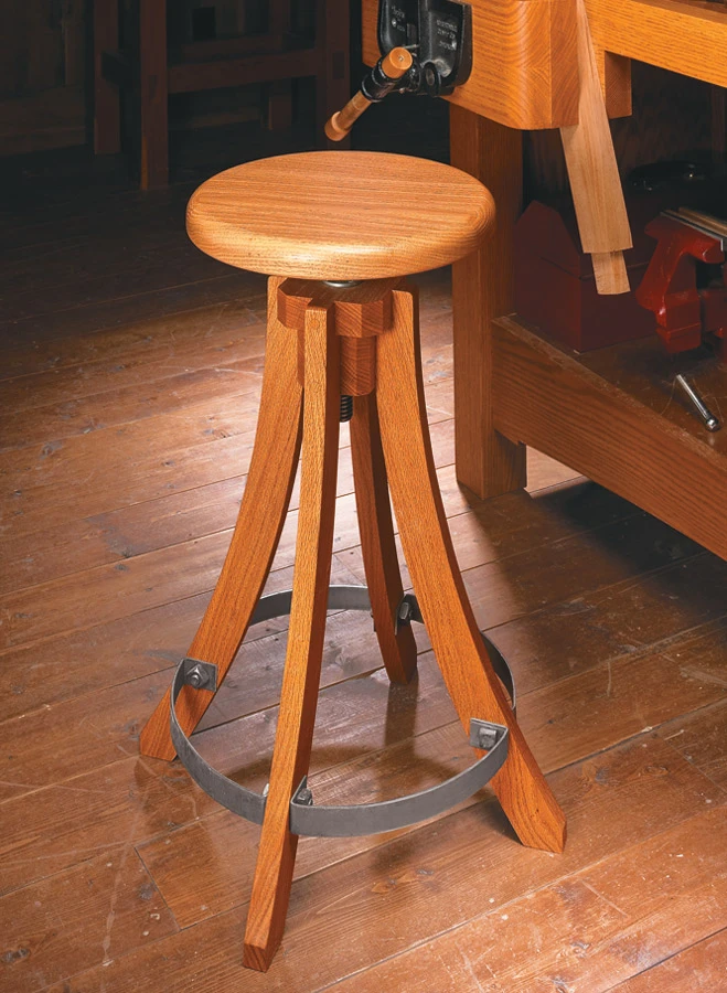 A good shop stool is a great asset for any shop. The challenge is how to design a comfortable stool that you can easily adjust in height. This adjustable stool answers the challenge. It’s made from solid hardwood. The shop-made metal straps provide stability and strength for the stool, and also serve as footrests. But what really sets this stool apart is how easily it adjusts. It raises and lowers by simply spinning the seat like an old-fashioned piano stool. The seat adjusts from 27″ to 33″. That capability allows you to work comfortably no matter where you park yourself in the shop.