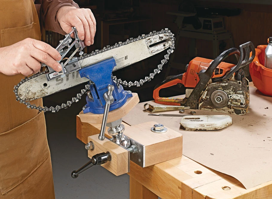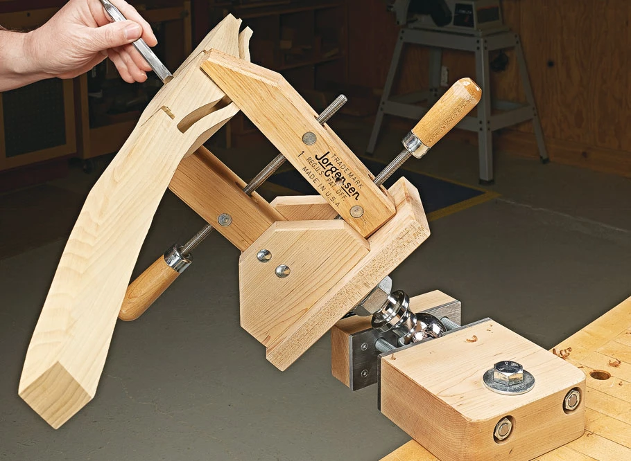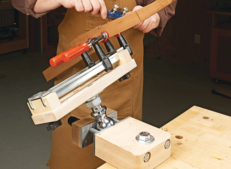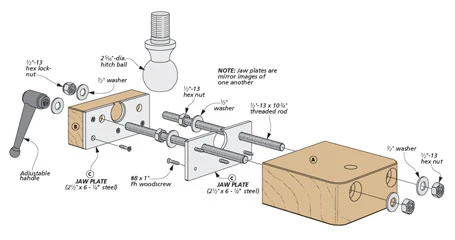 Having the ability to quickly rotate and position a workpiece is a huge advantage when performing certain tasks. However, finding the workbench space to permanently mount a tool that may not be used all the time isn’t the best use of space. The shop-built vise shown here is the perfect solution. This vise can be temporarily mounted to a workbench using existing dog holes and easily removed when not needed. But the genius of this vise is the use of a standard hitch ball between the vise jaws that gives you complete adjustability on two axes. Simply release the handle to rotate and tilt the workpiece to the position needed.