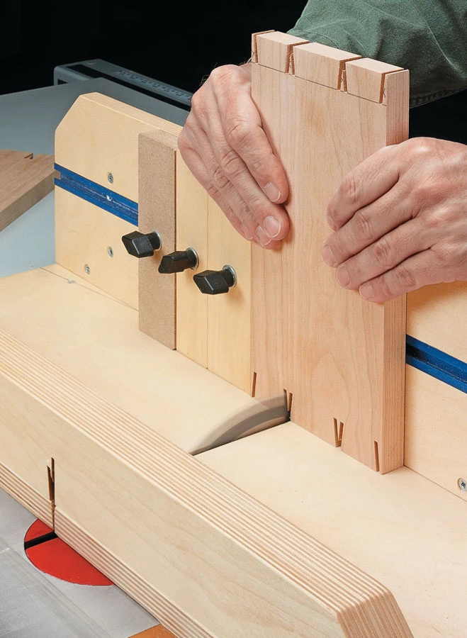 A table saw isn’t the first tool you think of when it comes to cutting through dovetails. Okay, maybe it’s not a tool you think of using at all. So it might surprise you to learn that you can use your table saw to make perfect-fitting through dovetails. All you need is a simple shop-built jig and a saw blade ground to leave perfectly angled corners. Best of all, this technique results in through dovetails with that distinct, “hand-cut” look. The jig is similar to a crosscut sled but the fence is adjustable to allow for cutting both the pins and tails. Besides the jig, you’ll also need a special saw blade for your table saw.