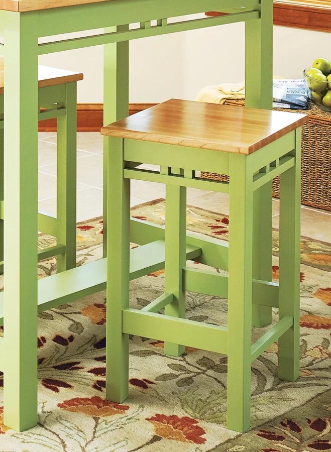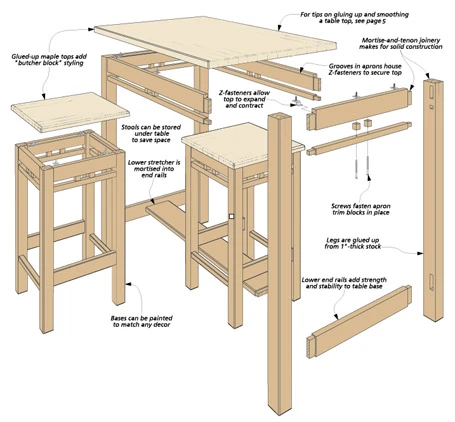 This table has light, contemporary styling and it doesn’t take up much floor space. The rounded edges on the table and stool tops make them comfortable. And the stools store neatly under the table in between meals to keep them out of the way (see photo, opposite page). There are several other reasons why I like this project. First is the way the table and stools are built. Mortise and tenon joinery makes them strong. And there aren’t any complicated angles to cut. Second, the bases are painted. This means you can keep the cost down by using an inexpensive hardwood like poplar. Finally, with just a few modifications you can make the work island shown in the plans. In any case, it’s a great fit for your kitchen.
